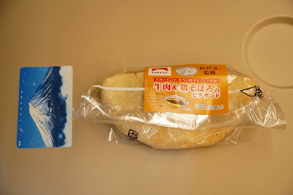 これは米沢駅弁の新杵屋が監修し、埼玉県の食品会社が製造し、駅のコンビニで販売。鶏そぼろ、チーズソース、牛肉たれ和え、きんぴら、たまご焼き、ピクルスマヨを詰めたピタサンドを、コンビニおにぎりかコンビニサンドのように透明な袋に詰めて、商品名などのシールを貼った。食べれば確かに、牛肉どまん中の牛そぼろ味がした。シールには鉄道開業150年のJRグループ共通ロゴに、今ではもはや謎の記号となった、牛肉どまん中の山形大学工学部とC・H・ダラスのマークもある。