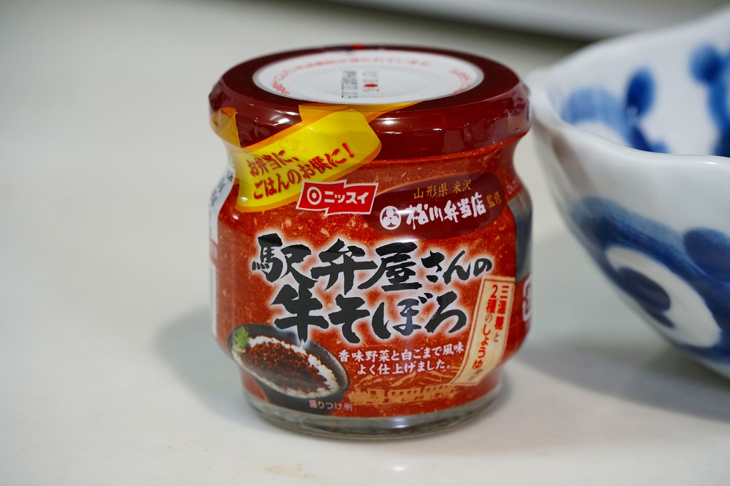 上記の商品「駅弁屋さんの牛そぼろ」の、2021年時点での姿。都城などのバージョンはすでになく、他の版や新作が出るわけでもなく、この米沢のみが十数年も売られ続ける息の長い商品となっている。スリーブはなくなり、分量は65グラムから55グラムに減らされステルス値上げとなったが、中身は変わらない。話題にならないが、ネットでも買える。価格は失念したが300円台か。