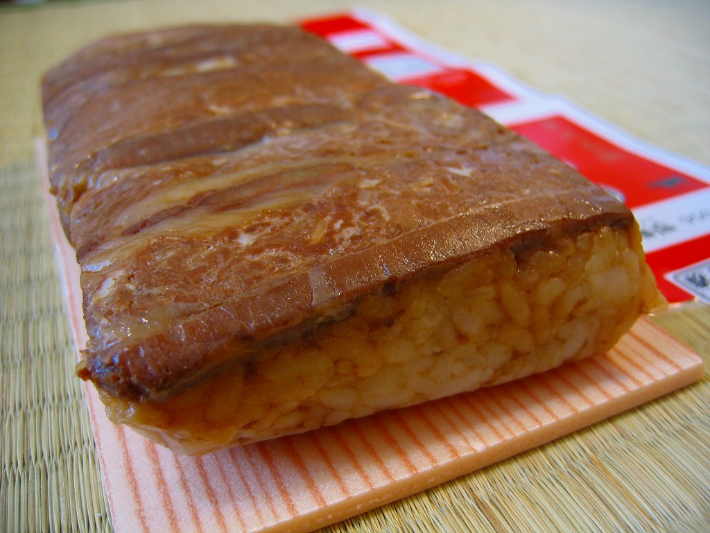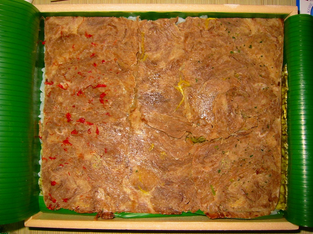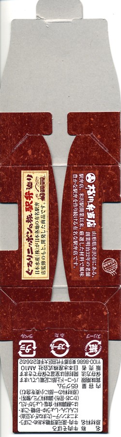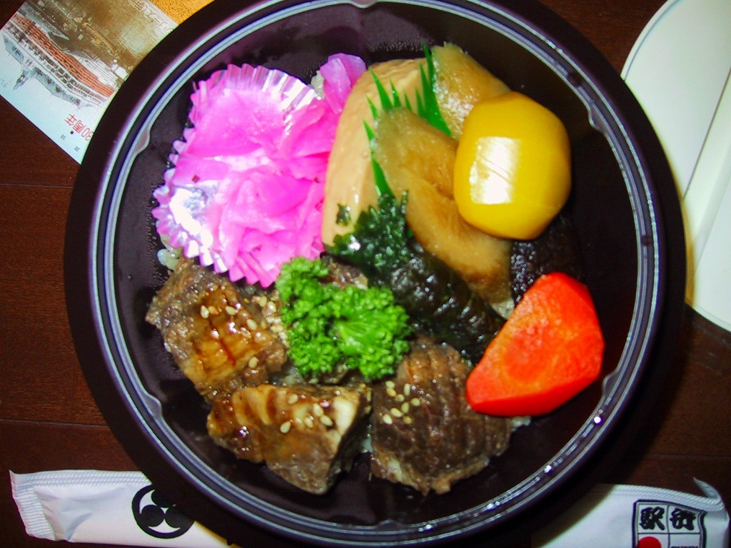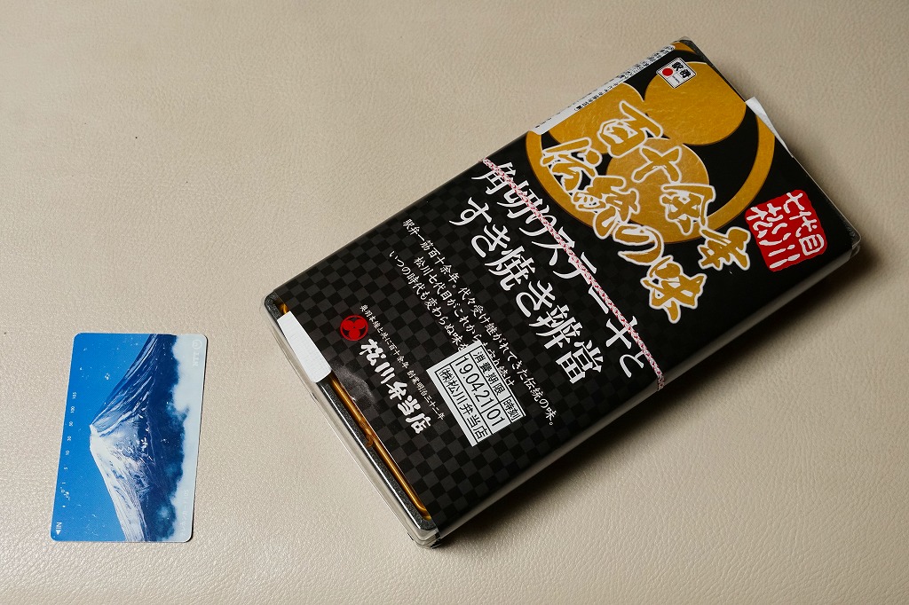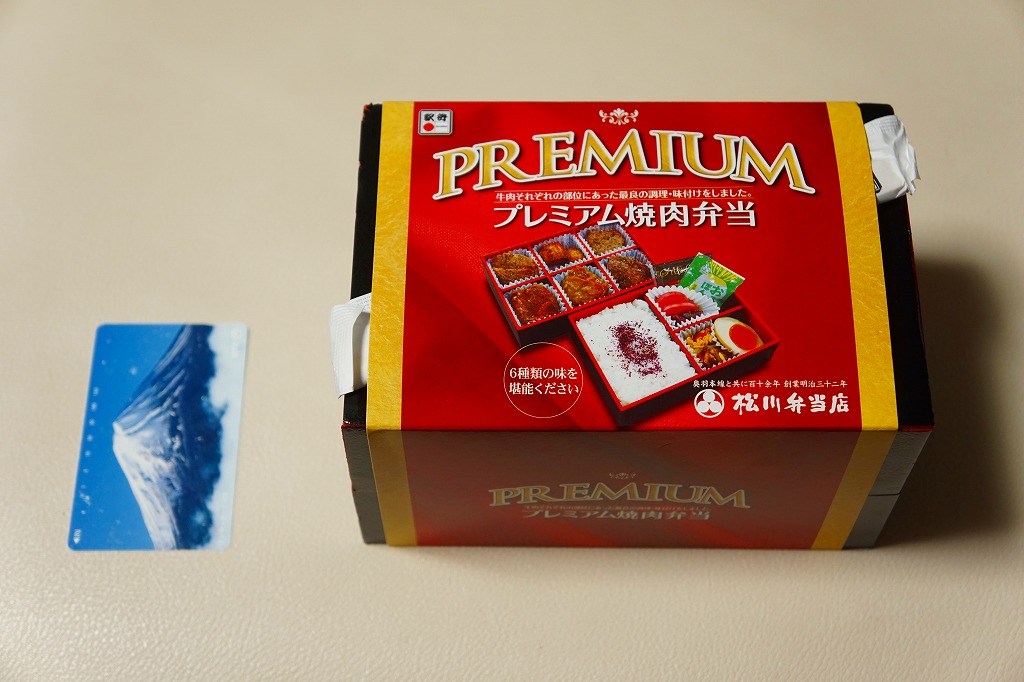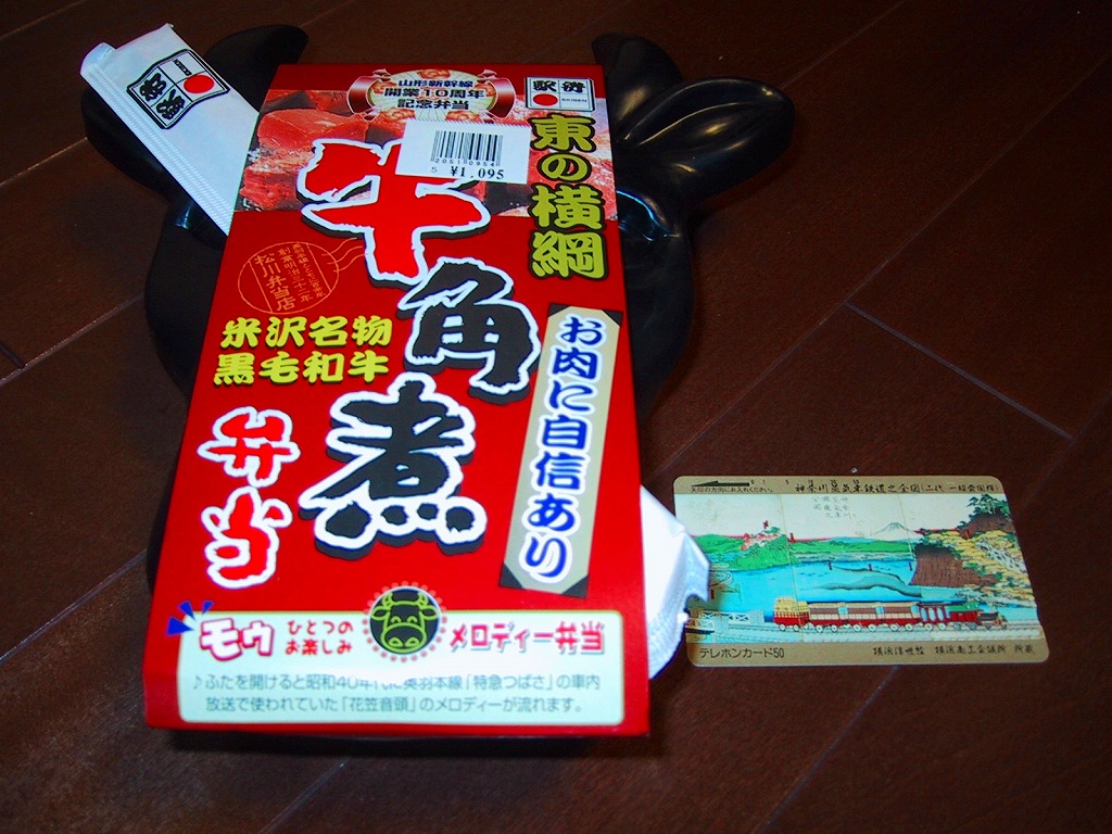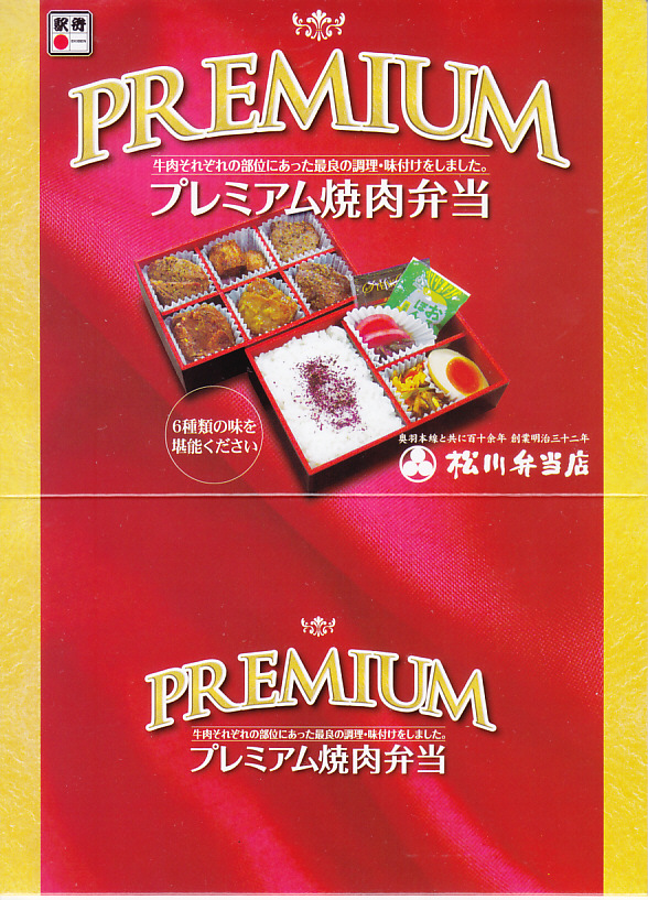 木目調の小さな容器に、商品名を書いた掛紙を巻く。真空パックになっている中身は、固結した棒状御飯に味付牛肉を貼り付けたもの。以前に買った「松茸入牛肉弁当」は不味かったが、こちらは牛肉のカルビ焼肉っぽい味が良好と感じた。しかし列車内で食べるものではない土産品であることは確かだろう。発売年も終売年も不詳。