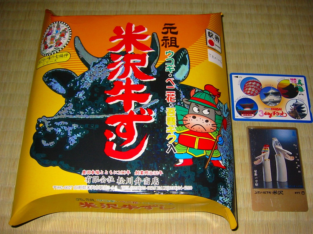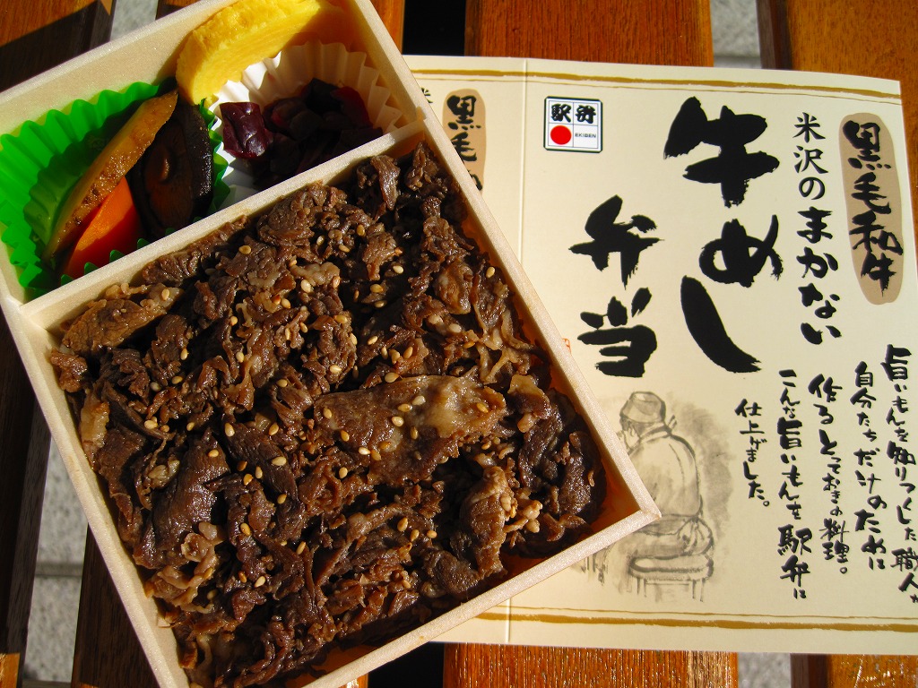 ボール紙の立体パッケージに小さな長方形の木目調容器を入れる。中身は酢飯の上に赤い紅花と黄色い吾妻菊と青いうこぎを信号機の順番で混ぜた柔らかな牛肉の板が載るもの。ステーキでも焼肉でもミンチでもない肉は不思議な食感で、少なくとも他の米沢駅牛肉駅弁よりはかなりあっさりしている。2005年頃までの販売か。