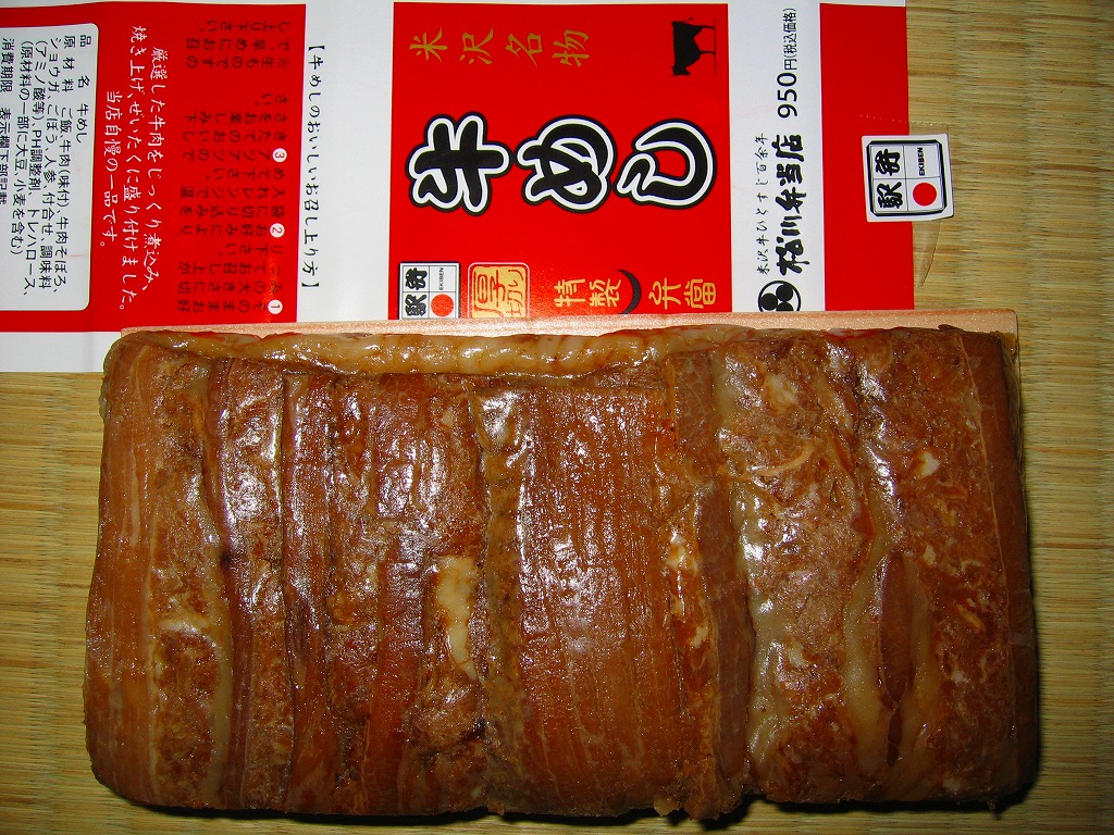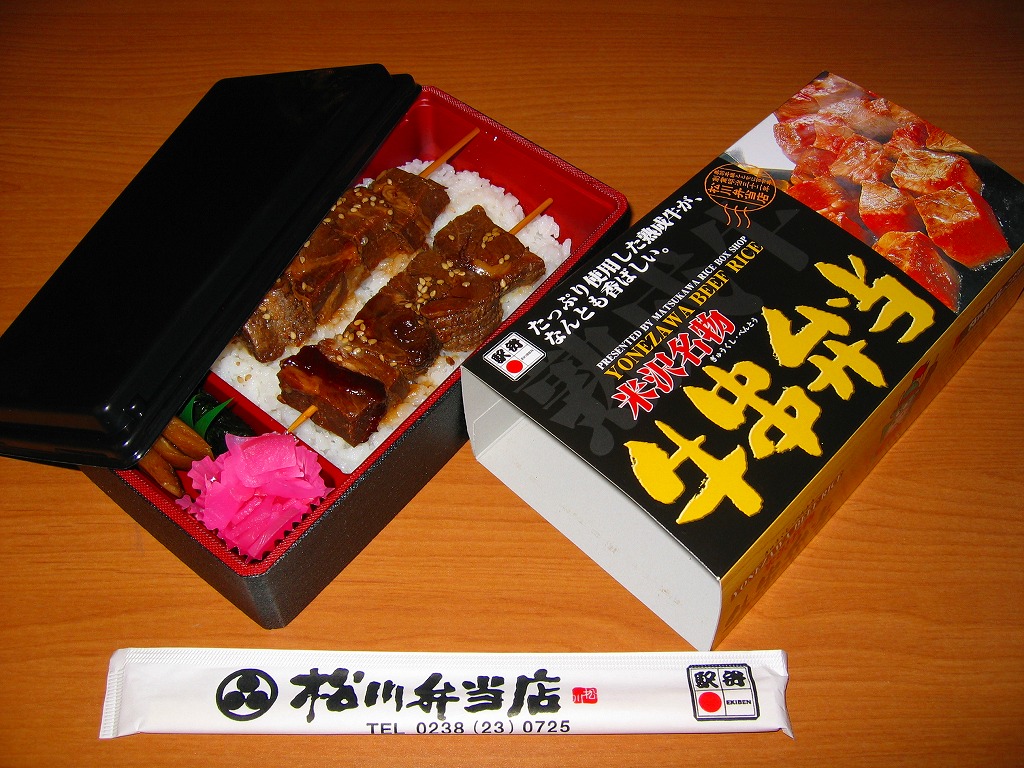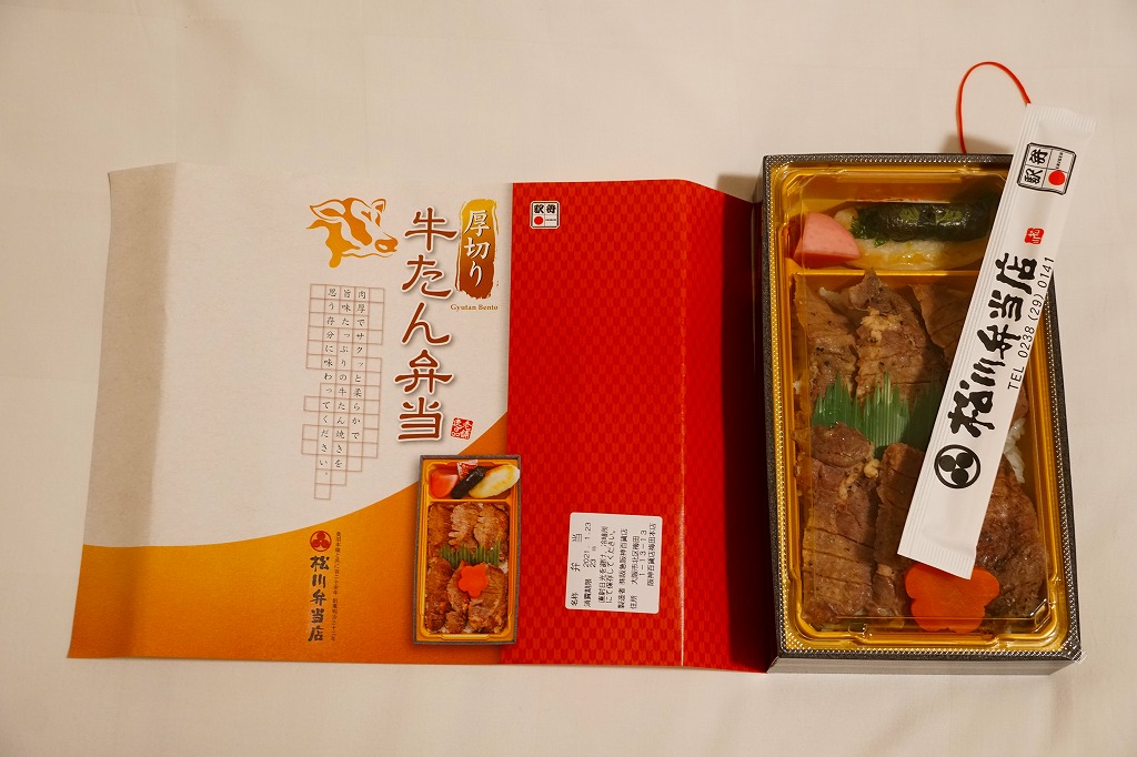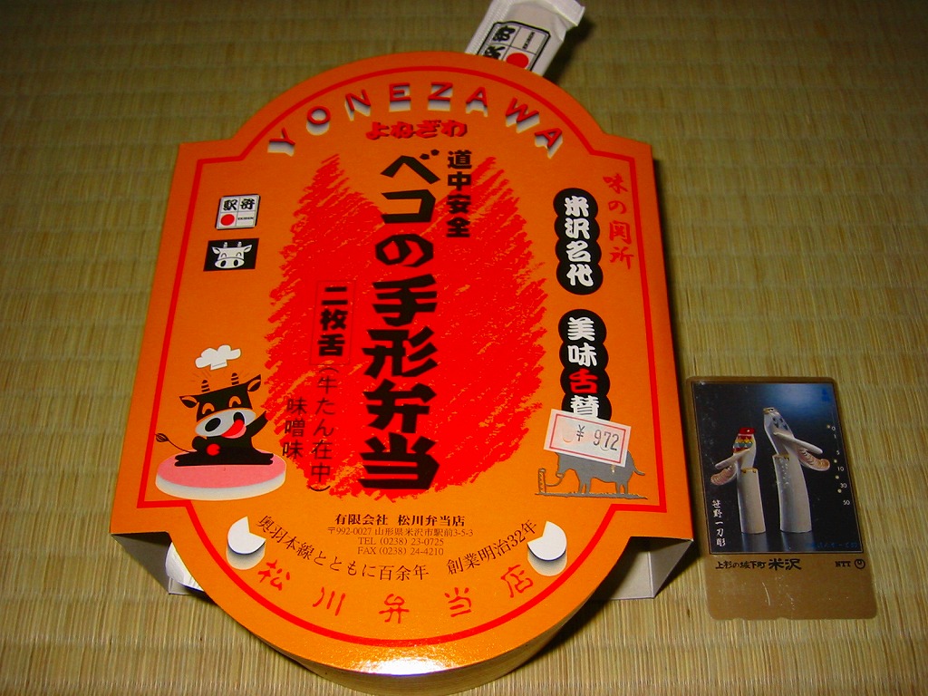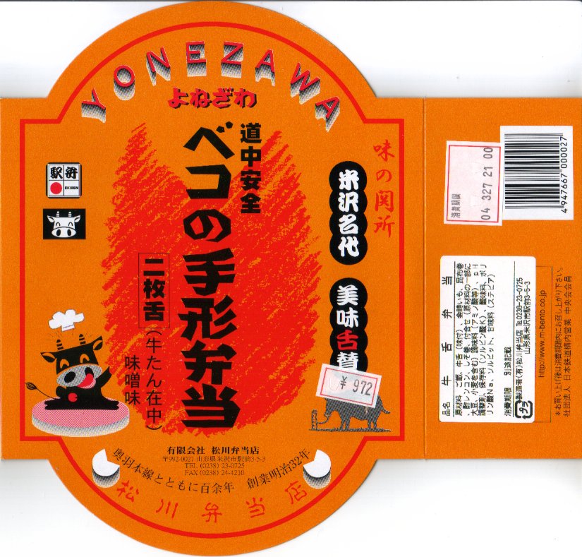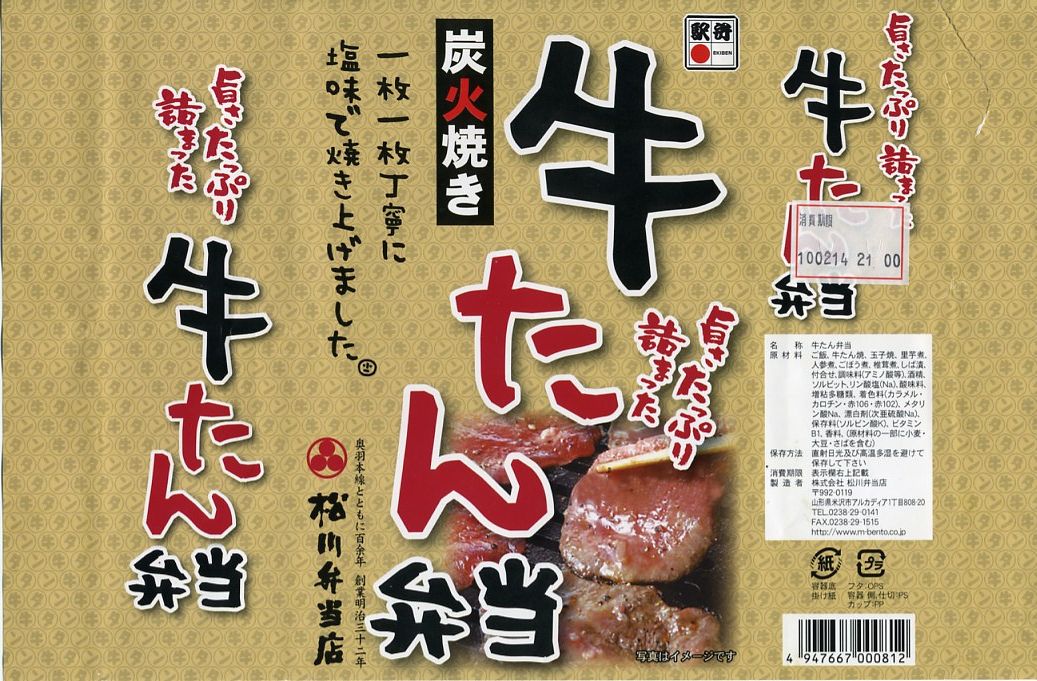 米沢駅の牛たん弁当の、松川弁当店版。小判型の容器をオレンジ色のスリーブに収める。中身は白御飯の上に牛たんの味噌焼を貼り、様々な漬物を添えるもの。牛たんの見た目と味は、人気で有名な仙台駅の駅弁よりも野暮ったい感じ。見栄えがするパッケージの記述「美味舌賛」「二枚舌」に、洒落っけが効く。2007年頃までの販売か。