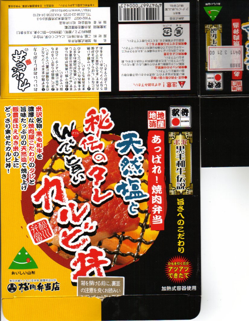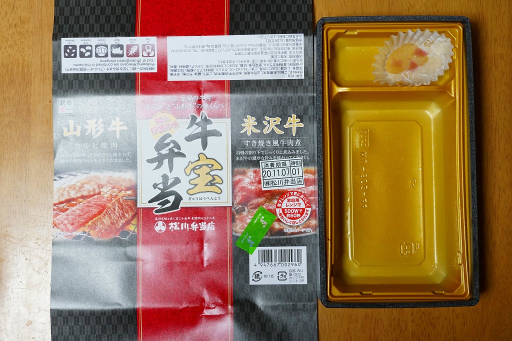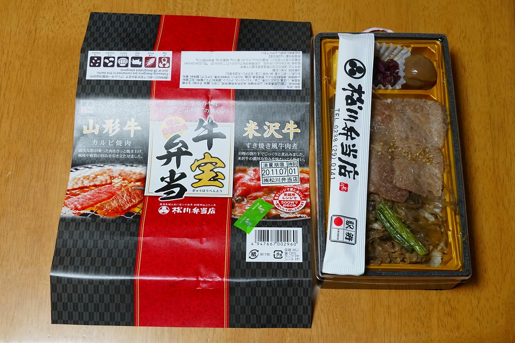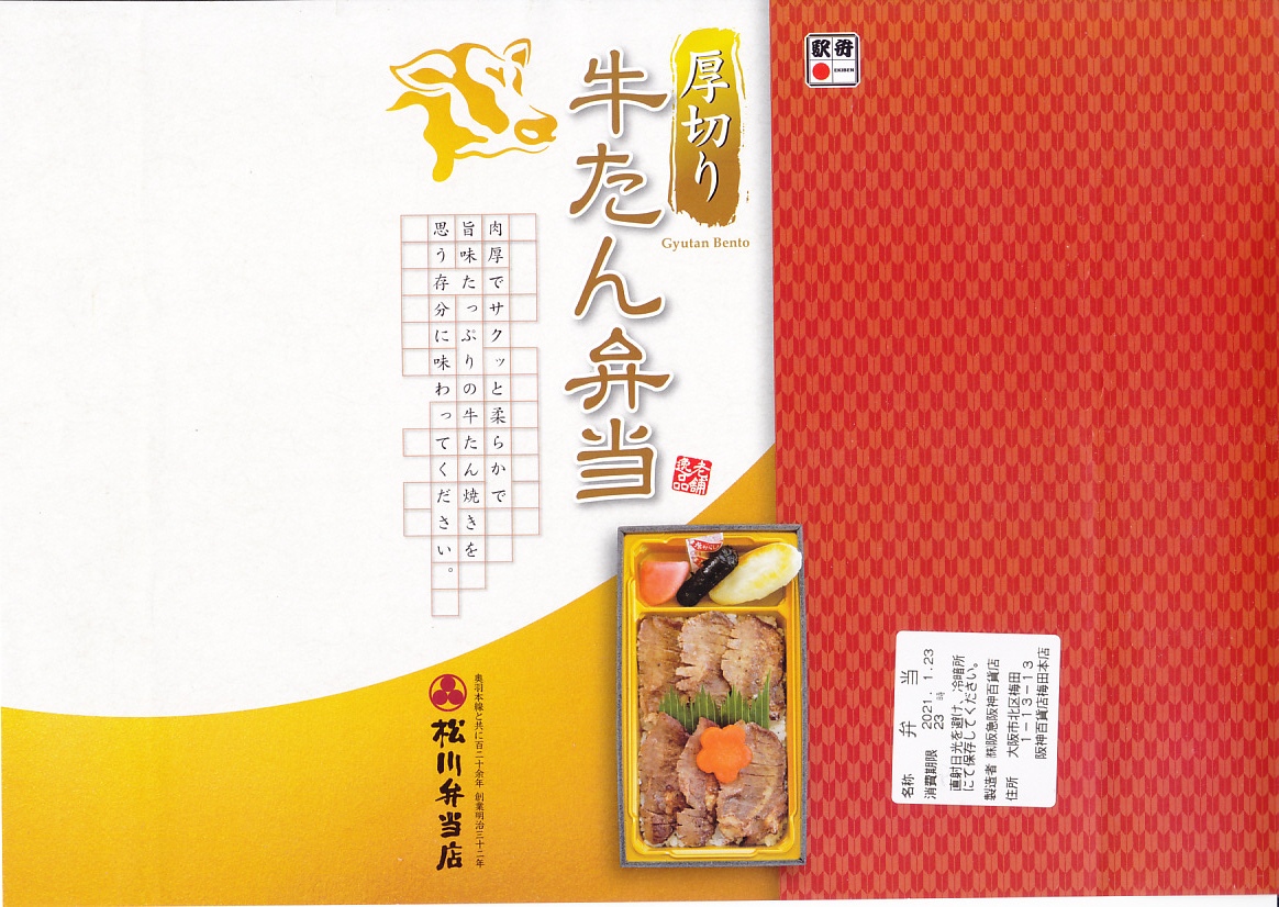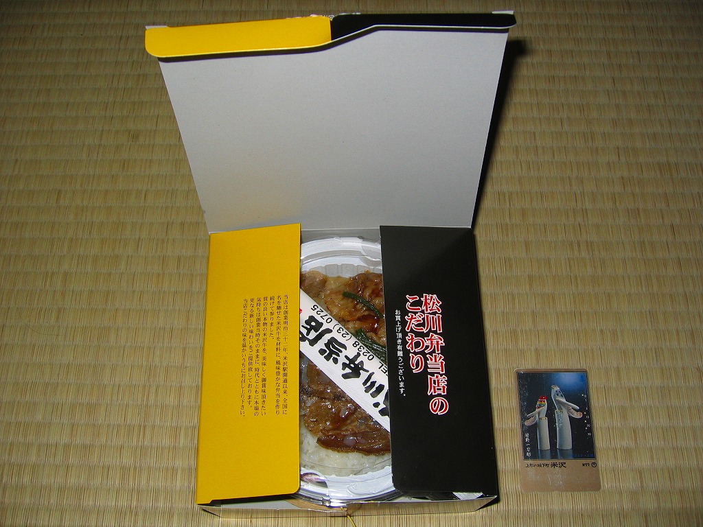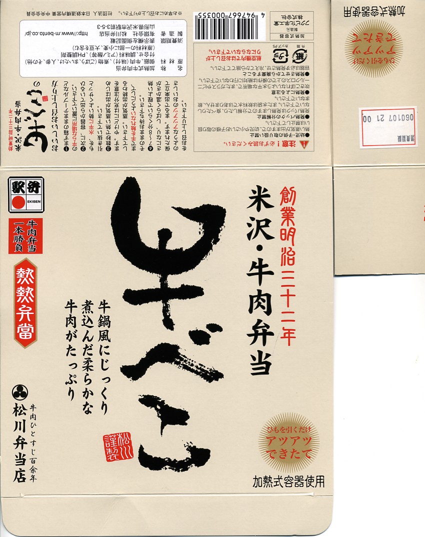 米沢駅の牛たん弁当の、松川弁当店版。小判型の容器をオレンジ色のスリーブに収める。中身は白御飯の上に牛たんの味噌焼を貼り、様々な漬物を添えるもの。牛たんの見た目と味は、人気で有名な仙台駅の駅弁よりも野暮ったい感じ。見栄えがするパッケージの記述「美味舌賛」「二枚舌」に、洒落っけが効く。2007年頃までの販売か。