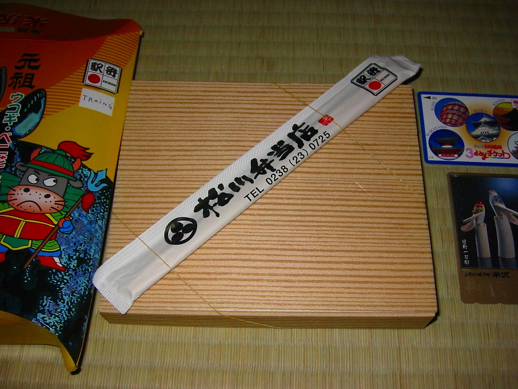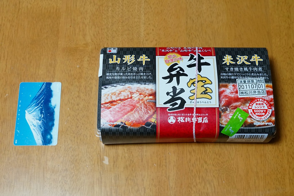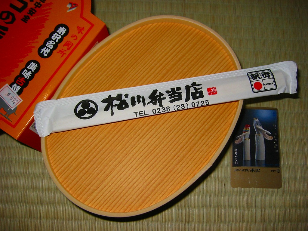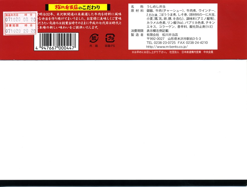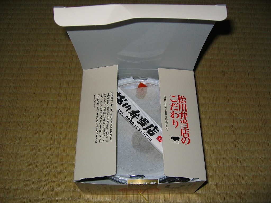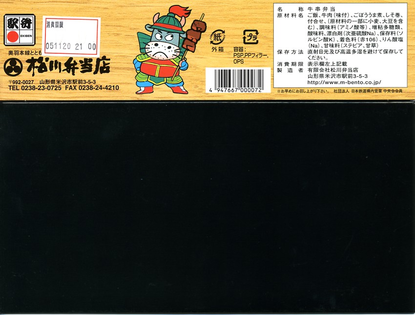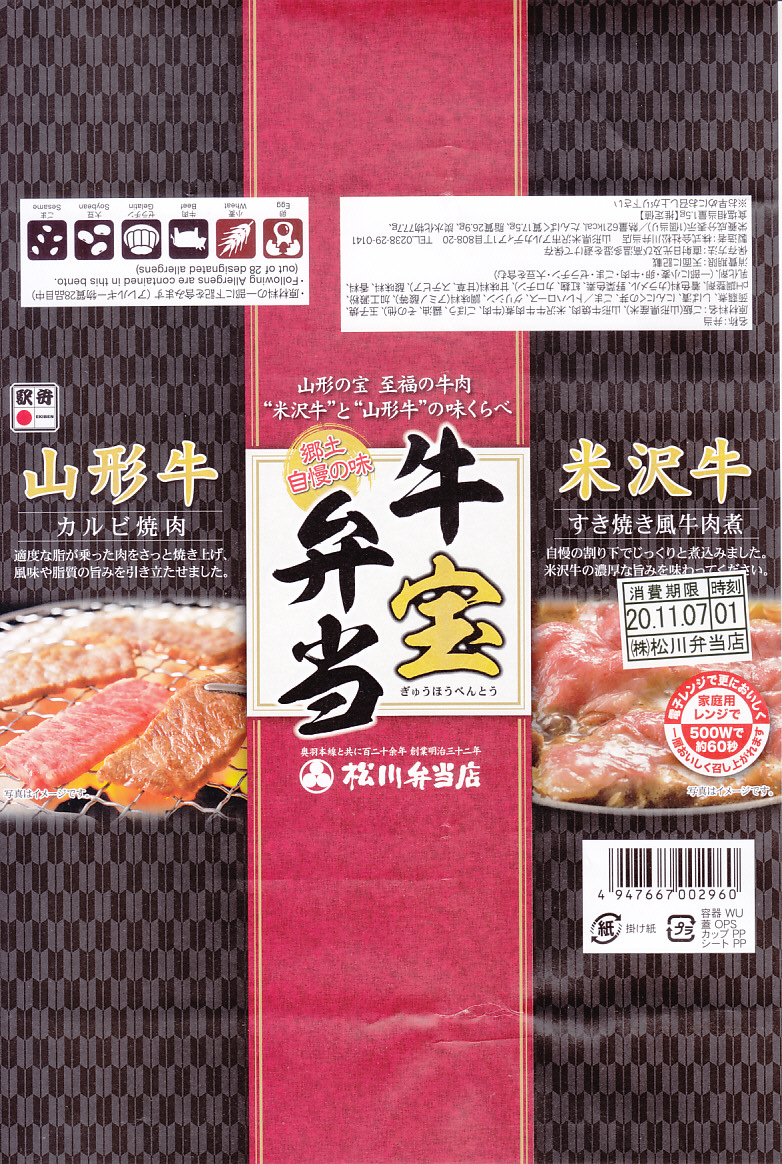 米沢駅の牛たん弁当の、松川弁当店版。小判型の容器をオレンジ色のスリーブに収める。中身は白御飯の上に牛たんの味噌焼を貼り、様々な漬物を添えるもの。牛たんの見た目と味は、人気で有名な仙台駅の駅弁よりも野暮ったい感じ。見栄えがするパッケージの記述「美味舌賛」「二枚舌」に、洒落っけが効く。2007年頃までの販売か。