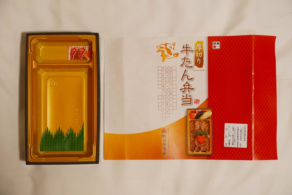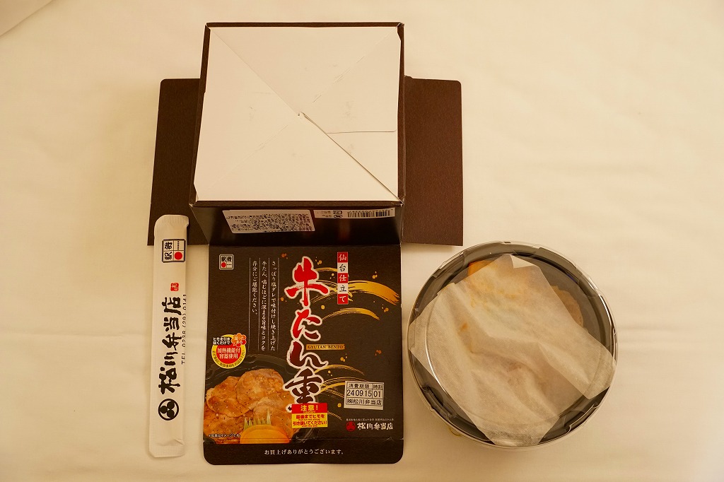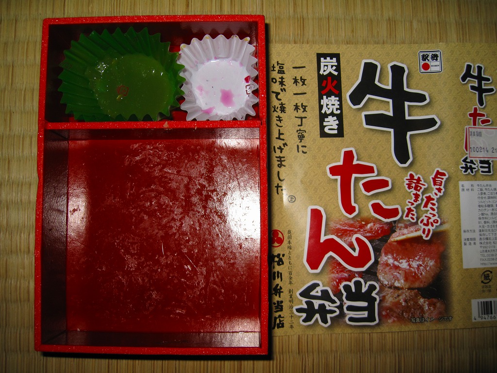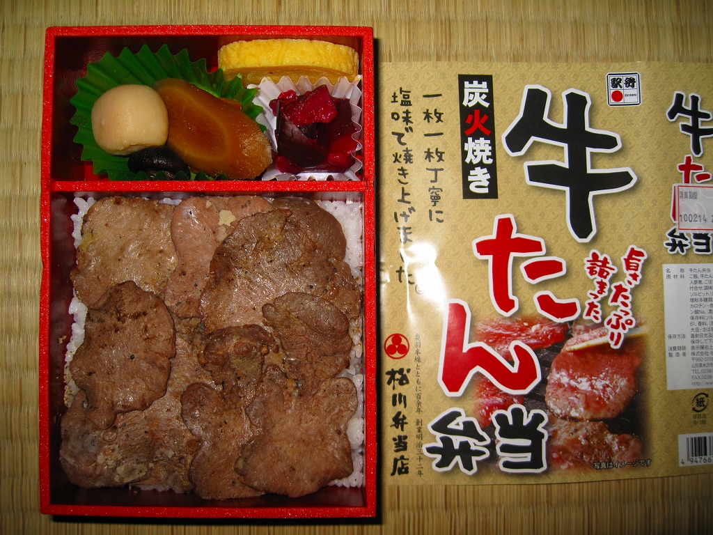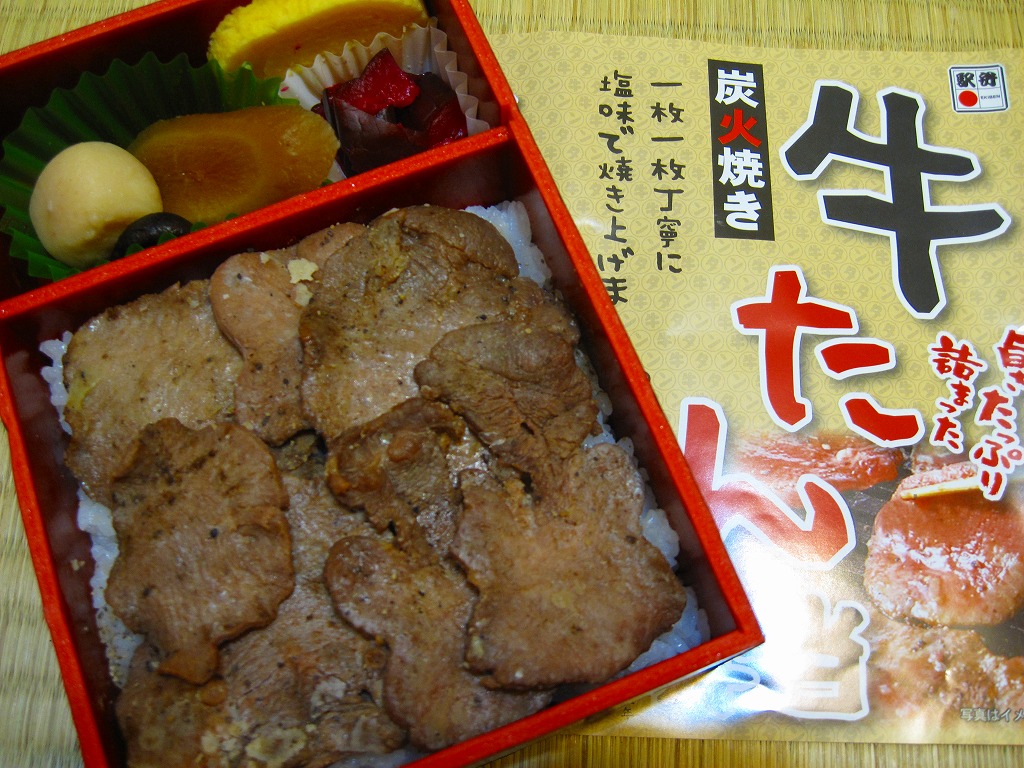 秋冬の駅弁大会シーズンに向けた、2009(平成21)年秋の新商品か。長方形で黒塗りの赤い容器に透明なふたをして、商品名と牛タン焼肉の写真を書いた掛紙を巻き、ゴムで留める。中身は白御飯の上に牛タンの塩焼きを貼り付けて、玉子焼や煮物類や柴漬けを添えるもの。付合せの味付けが濃厚すぎて箸休めの役目を果たしていないが、適度な分量と固さと味付けを持つ牛たん塩焼きが御飯に合う。