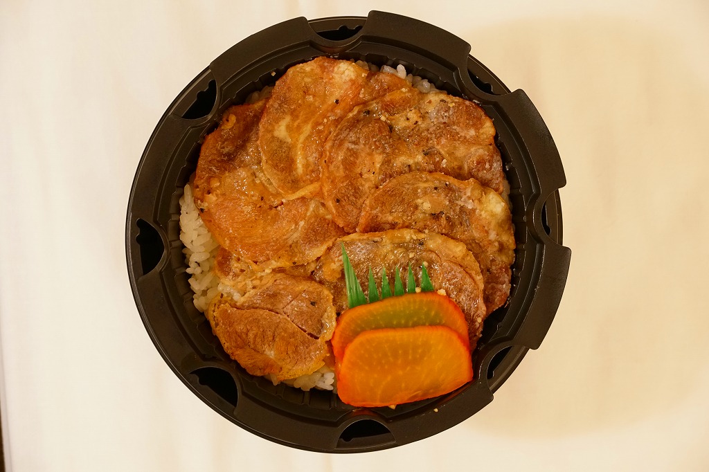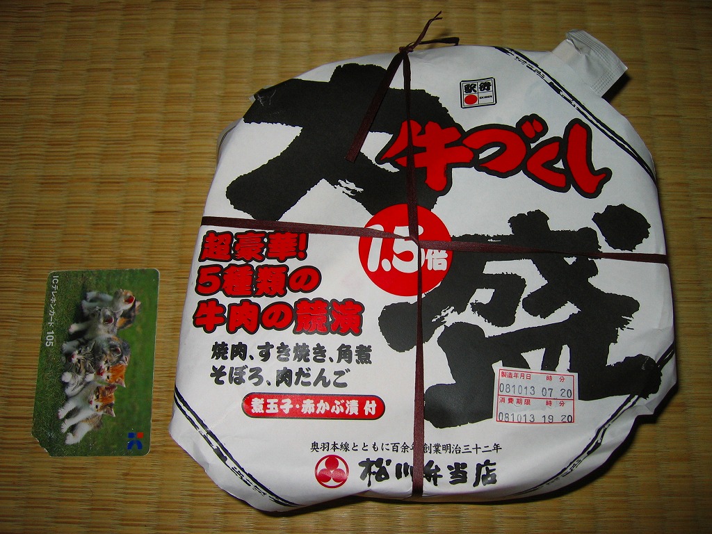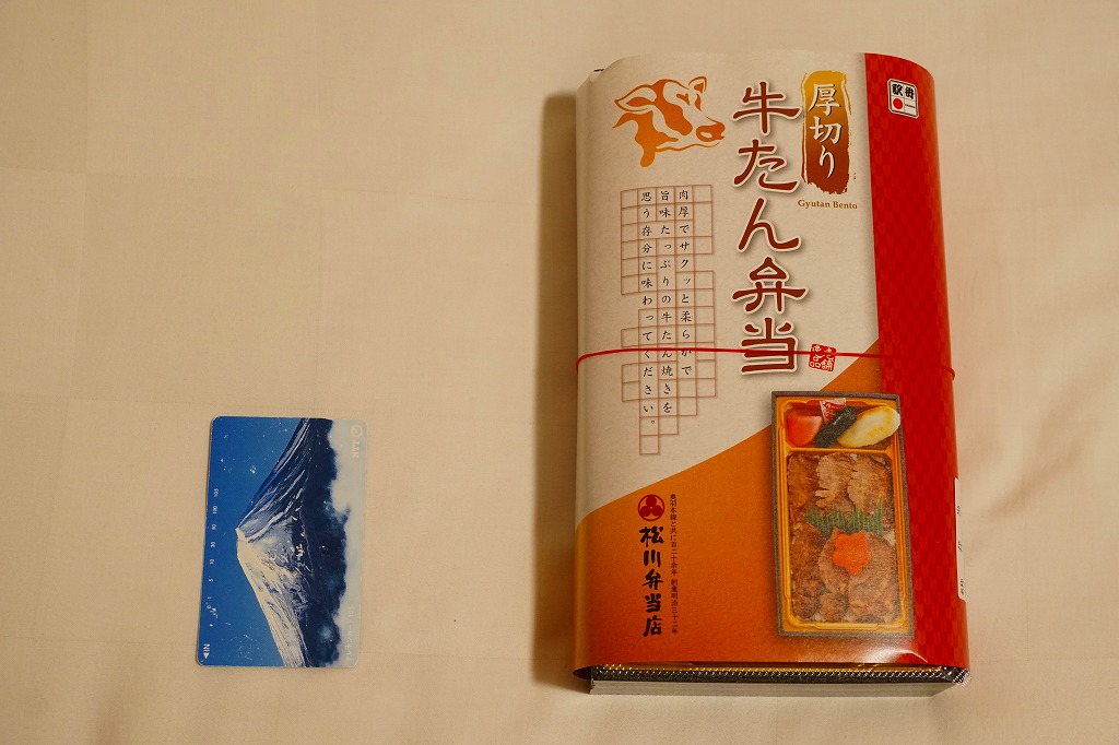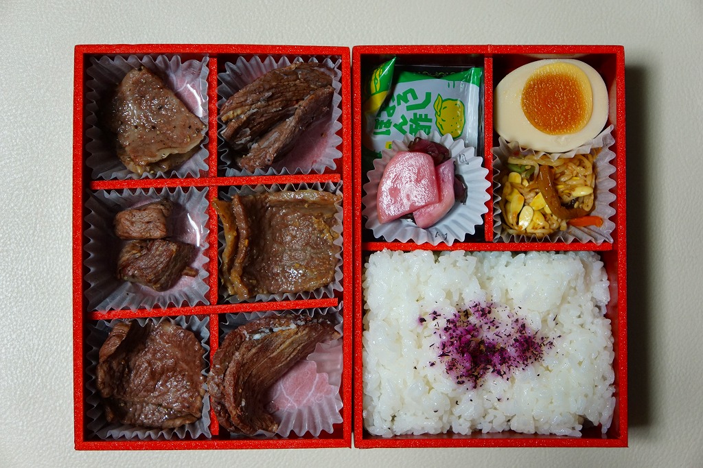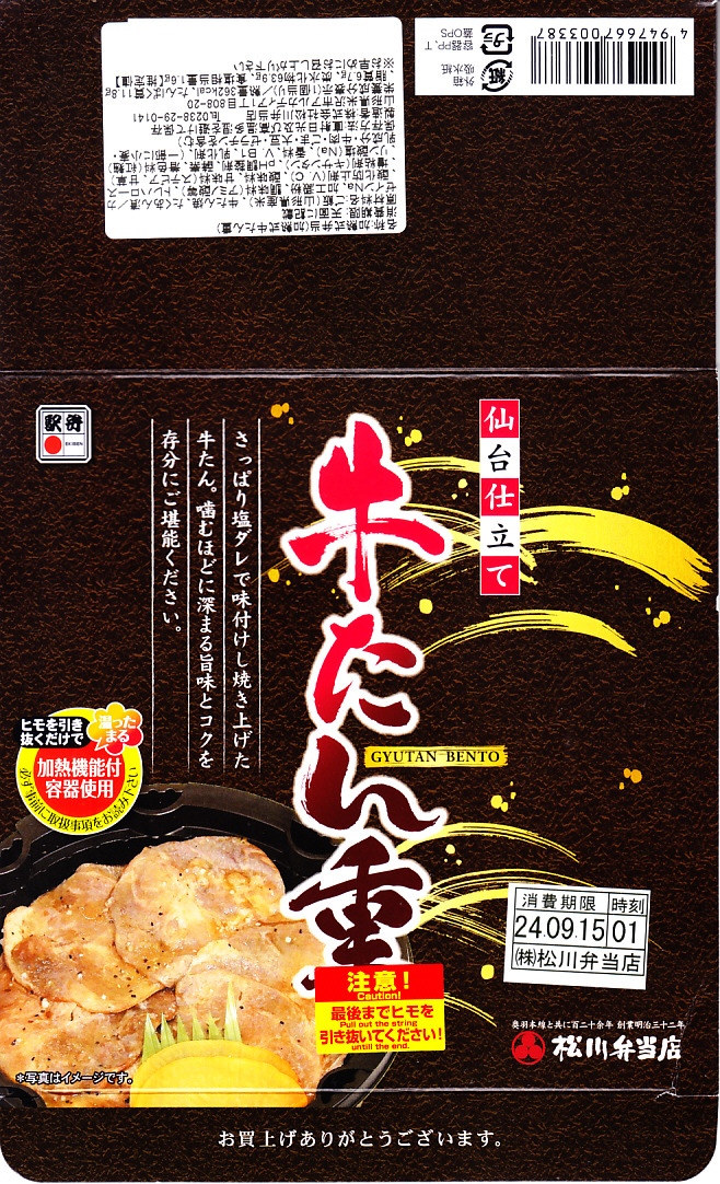 秋冬の駅弁大会シーズンに向けた、2009(平成21)年秋の新商品か。長方形で黒塗りの赤い容器に透明なふたをして、商品名と牛タン焼肉の写真を書いた掛紙を巻き、ゴムで留める。中身は白御飯の上に牛タンの塩焼きを貼り付けて、玉子焼や煮物類や柴漬けを添えるもの。付合せの味付けが濃厚すぎて箸休めの役目を果たしていないが、適度な分量と固さと味付けを持つ牛たん塩焼きが御飯に合う。