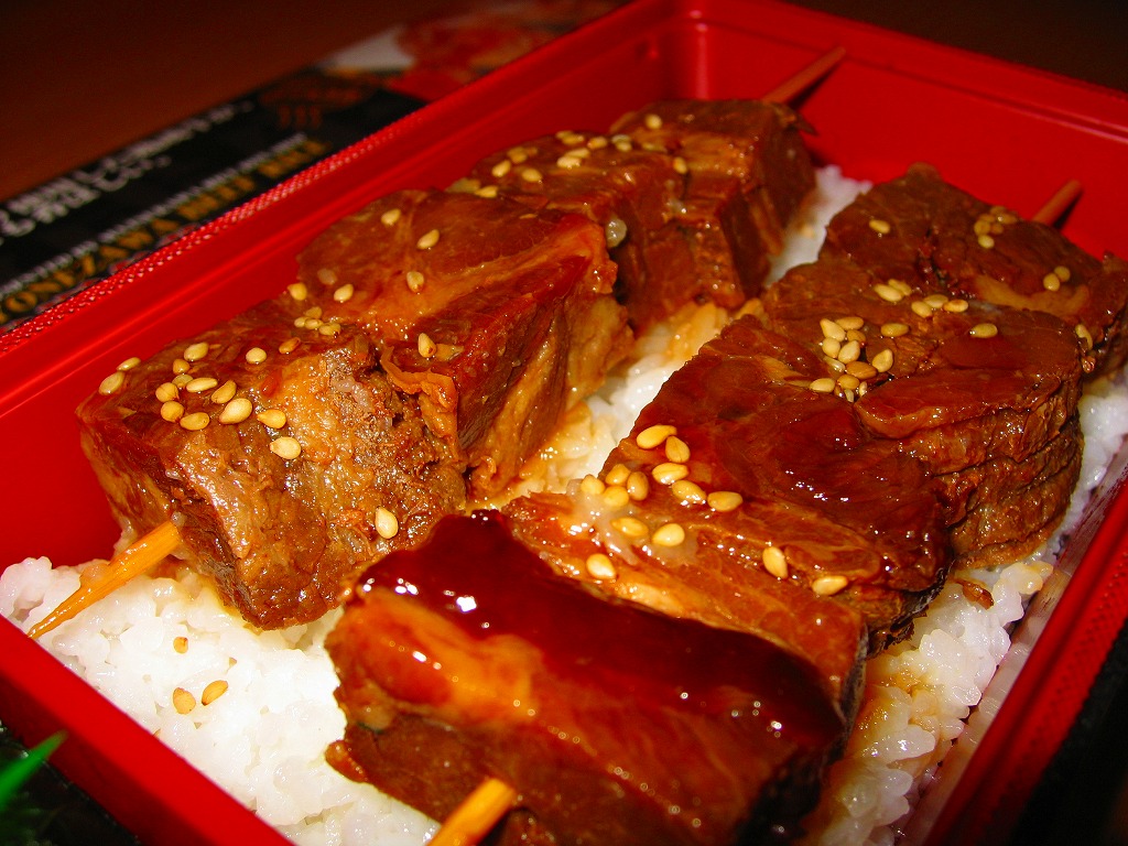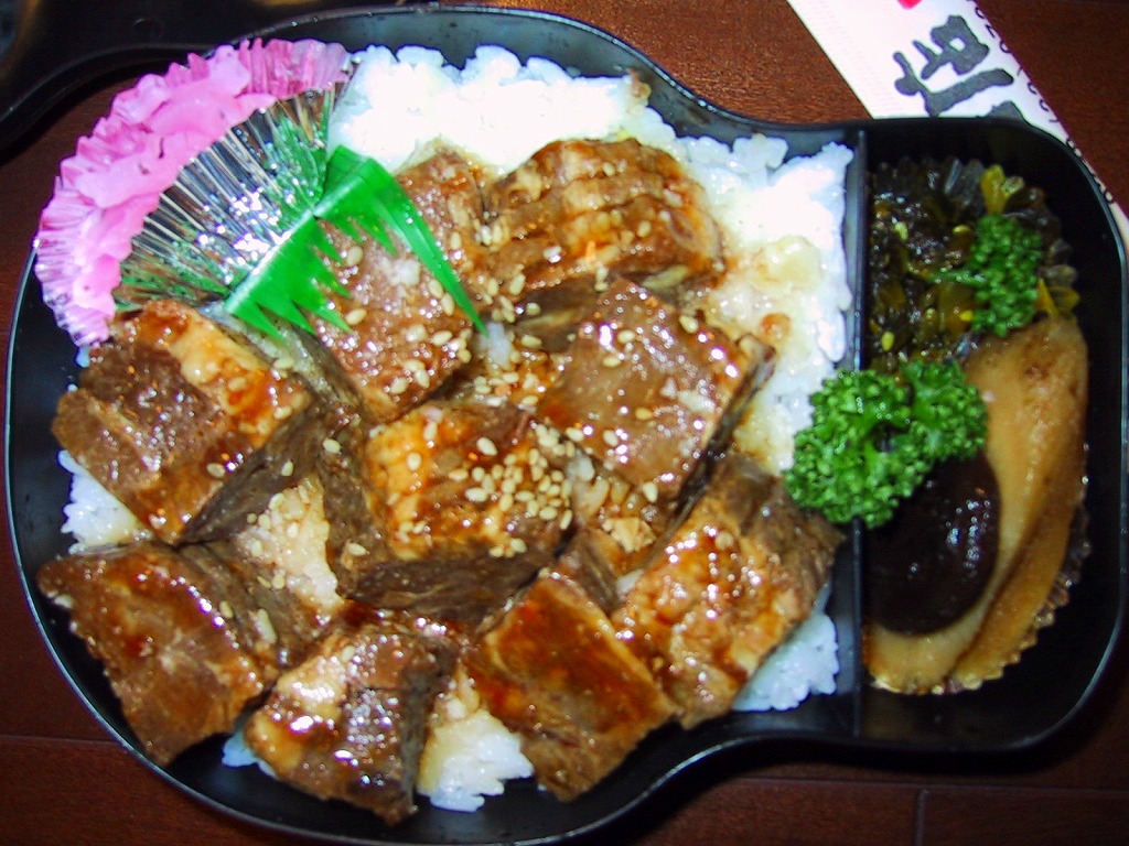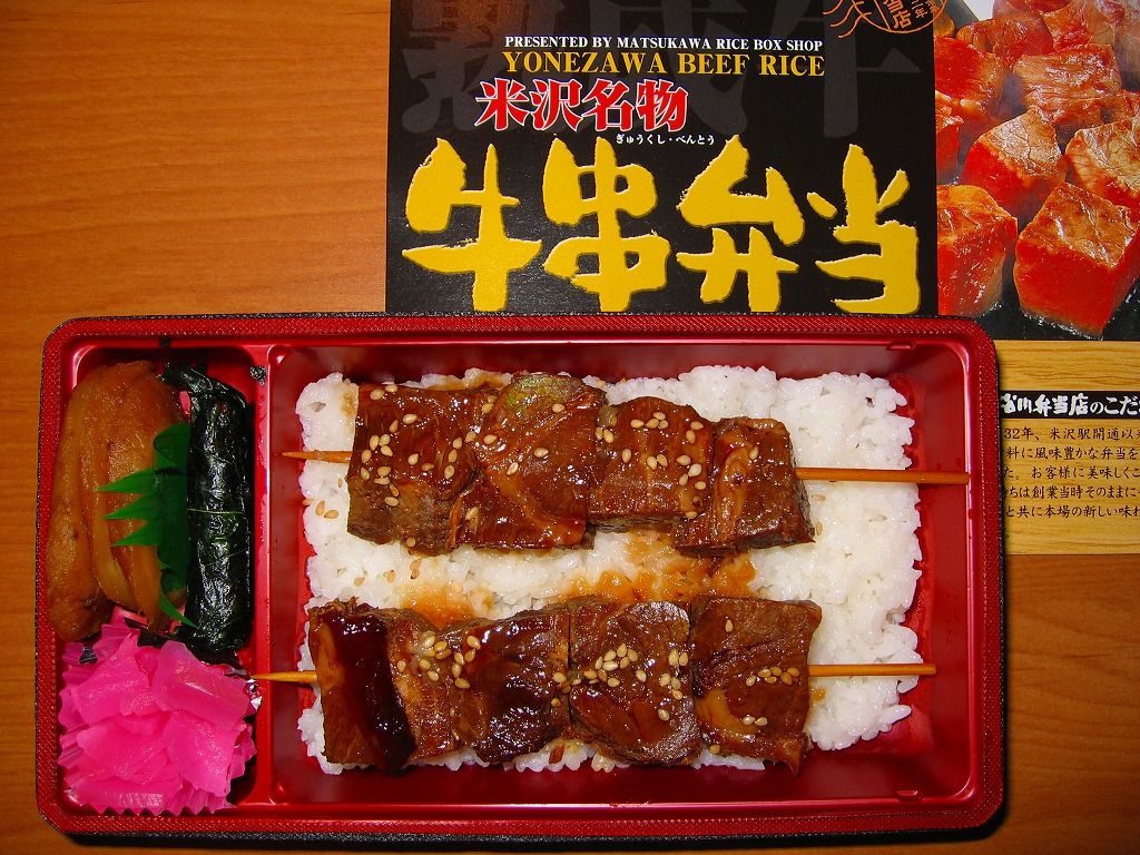 2001(平成13)年4月に発売。フルカラー写真を掲載した豪華なボール紙製のパッケージの中に、木目を印刷した発泡スチロール製の長方形の容器が入り、牛サイコロステーキを4個串刺しにした牛串が2本、白御飯の上に載る。160gも使ったという肉の風味を引き立てるタレに、常温なのに口の中で溶けてゆく食感。付け合わせの大切りのゴボウも負けてはいない。冷蔵でも悪くない味。価格は2005年の購入時で1,000円、2010年時点で1,100円、2014年時点で1,150円。