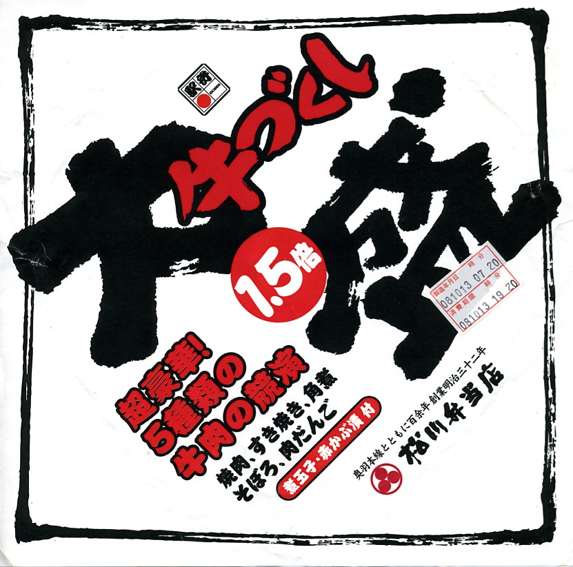 牛肉の味付けが生姜と醤油なのだそうだが、この調製元の他の牛丼駅弁に比べて、やっぱり間違い探しの範囲でしか違わない。味もその点では良好。こういうことをしないと、あるいはさせられないと、東京に見向きもされなくなってしまうしまうという危機感か、地元を離れて東京へ進出し成功したいという野心か、普通の駅弁屋にはあまり見られない背景を想像してしまう商品だと感じた。価格は2009年の購入時で1,050円、2017年時点で1,150円、2020年時点で1,200円。2019年頃までの販売か。