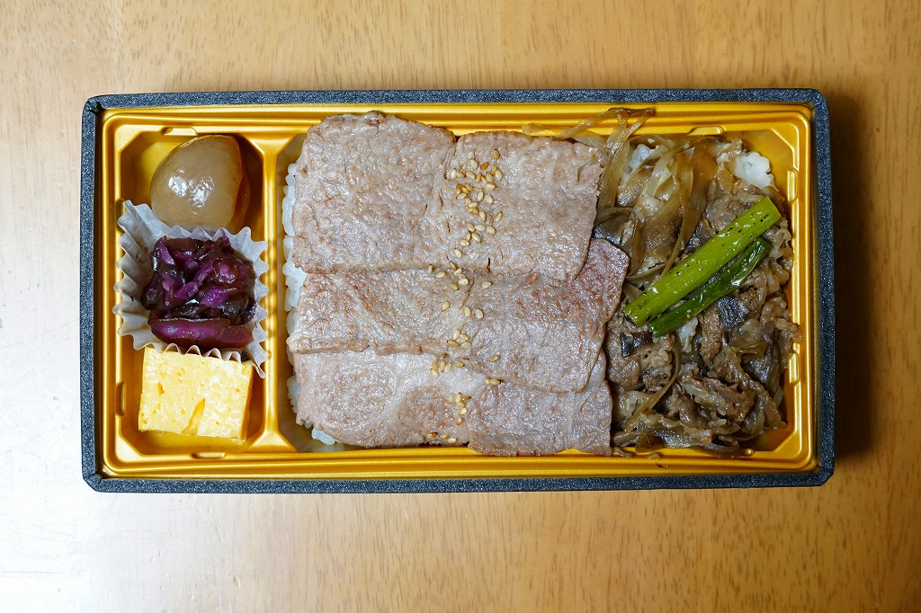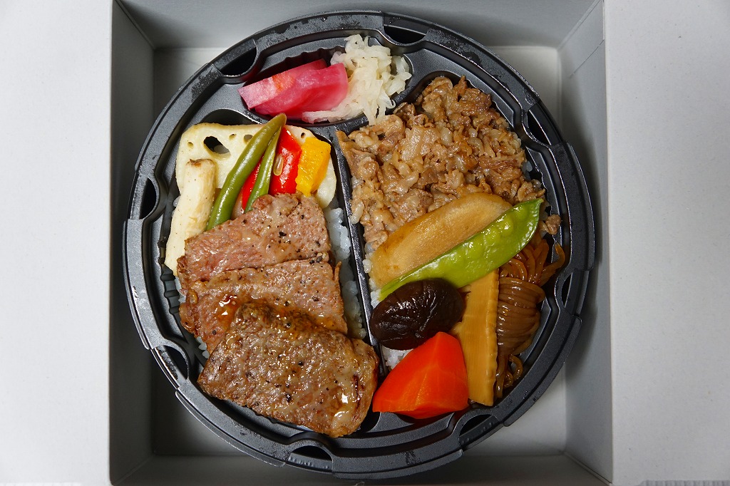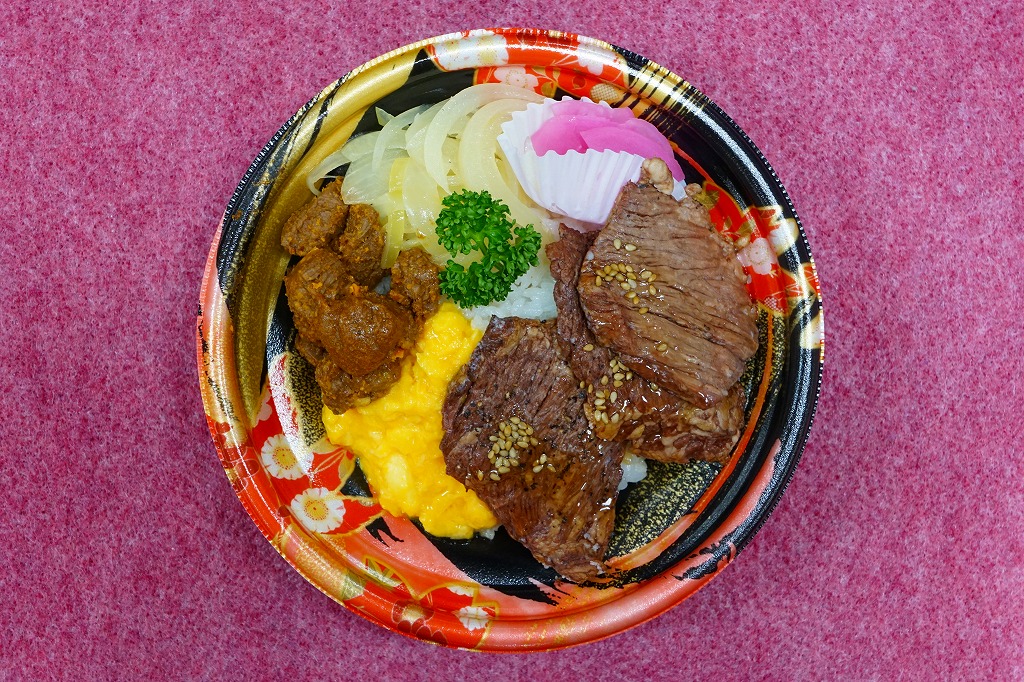 2017(平成29)年12月に東京駅や上野駅で販売、翌2018(平成30)年1月に京王百貨店の駅弁大会で販売。円形の加熱機能付き容器に、レンコンやパプリカも入る牛ステーキ丼と、ニンジンやゴボウなどの煮物も入る牛すきやき丼と、漬物を詰める。加熱機能付き駅弁のイメージを覆す白飯の多さで、分量は十分。2019年までの販売、2021年までの掲載か。