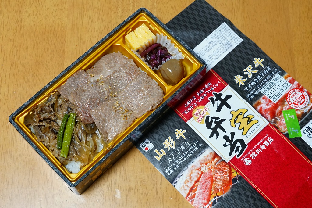 2020(令和2)年9月までの発売は、同年10月からのJR東日本の駅弁キャンペーン「駅弁味の陣2020」へのエントリーに向けたものか。長方形のプラ容器に白飯を詰め、牛焼肉と牛肉煮で覆い、玉こんにゃく、玉子焼、柴漬けを添える内容は、今までの米沢駅弁と変わらない。今回は牛焼肉に山形牛カルビ、牛肉煮に米沢牛を使い、ひとつの弁当で県内のブランド牛を対決させた。高価であるも、常温でおいしい牛肉。価格は2020年の発売時や購入時で1,480円、2023年時点で1,490円。