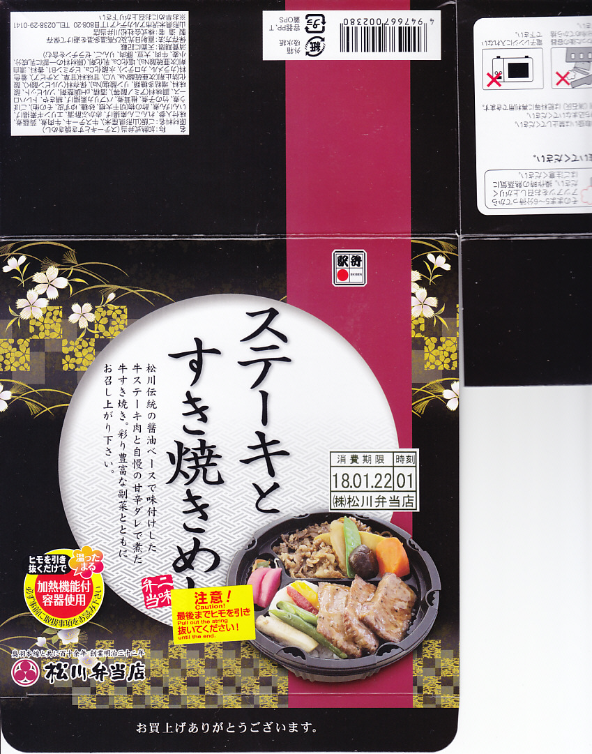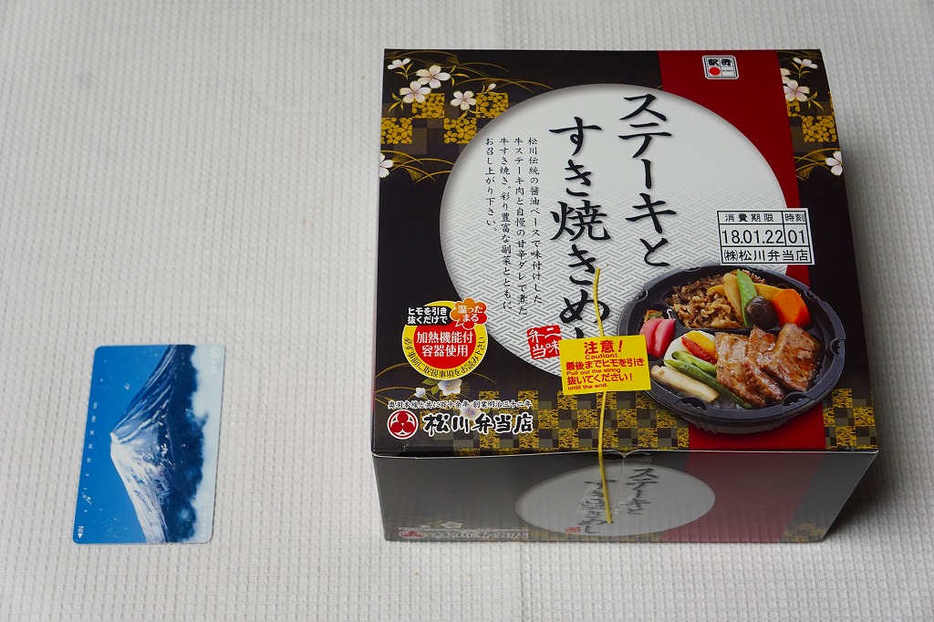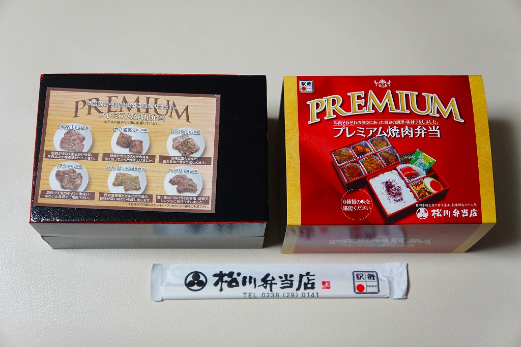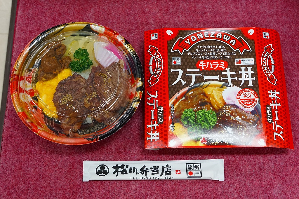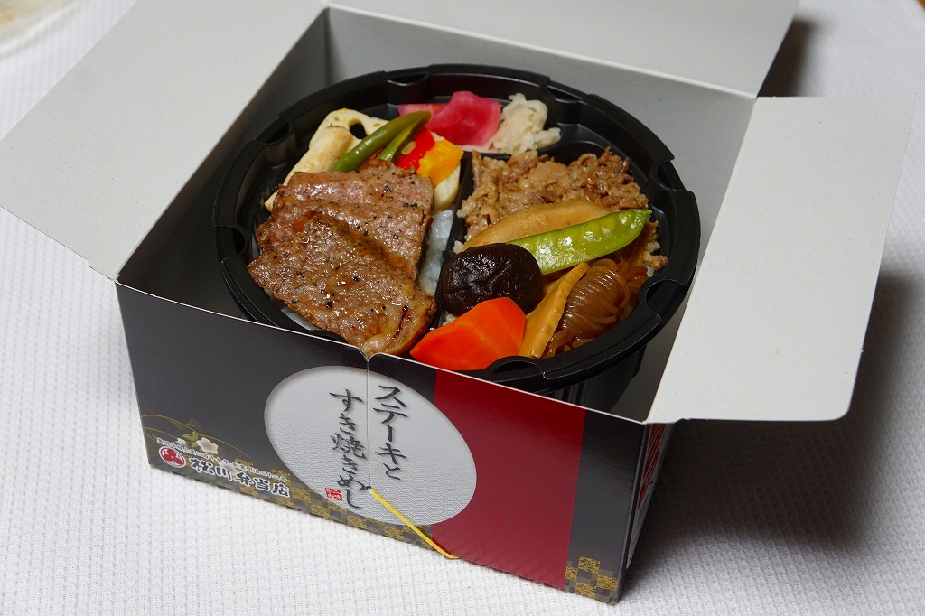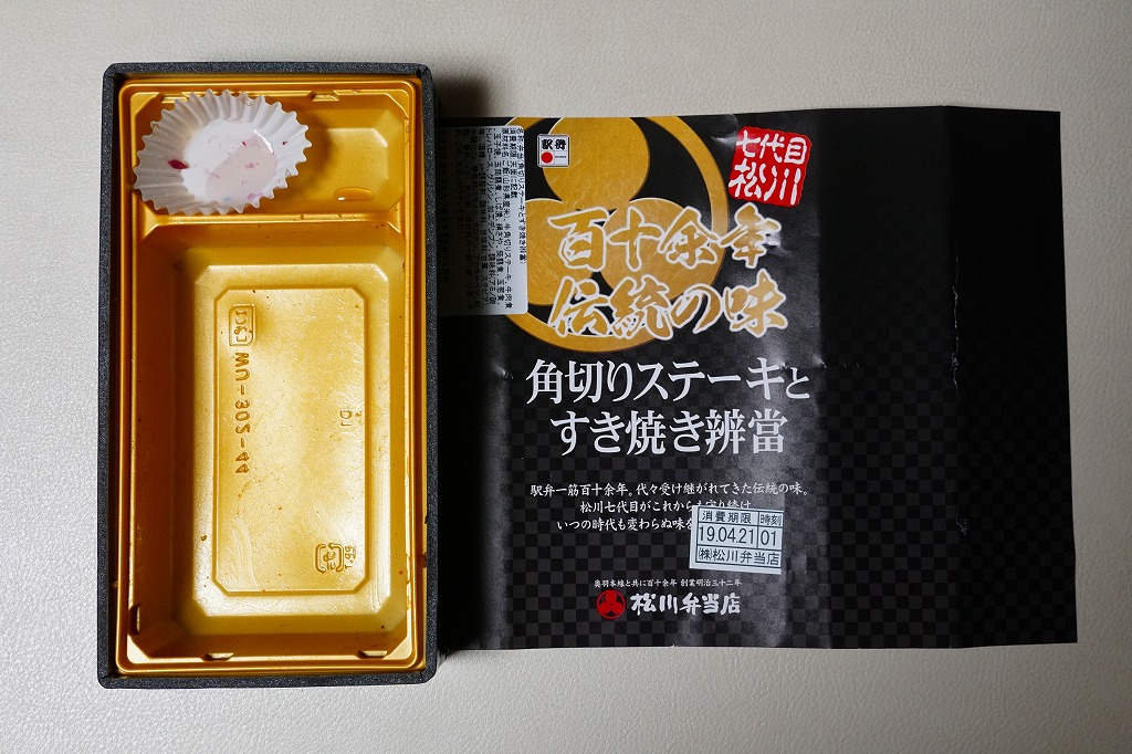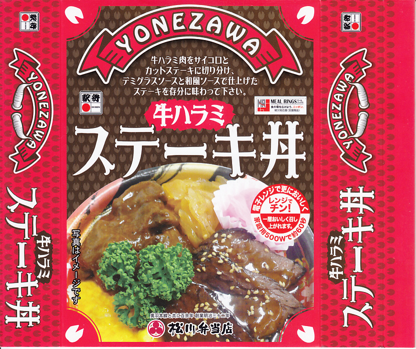 秋冬の駅弁大会シーズンに向けた、2018(平成30)年秋の新商品か。掛紙には「七代目松川」や「百十余年伝統の味」のキャッチが目立つ。中身は白飯+牛肉+付合せという、牛肉駅弁で定番の構成。牛肉煮に加えて斜めに5個配置した牛角切りステーキは、焼き鳥大で弾力があり、常温の弁当で食べやすいものになっていた。2022年までの設定か。