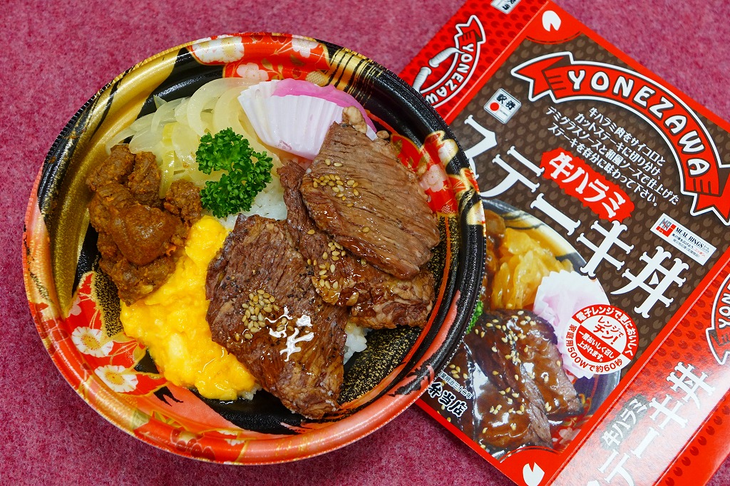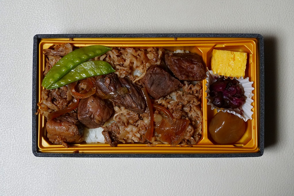 2014(平成26)年4月の発売か。駅弁の名前のとおり、そしてパッケージの写真のとおり、丼に白御飯を敷き、牛ハラミ肉のサイコロステーキとカットステーキ、タマネギ炒め、スクランブルエッグ、ダイコン酢漬けで覆う牛肉丼。冷たいのに柔らかくかみ切れる牛焼肉の味を、タマゴとタマネギがうまく補佐する。