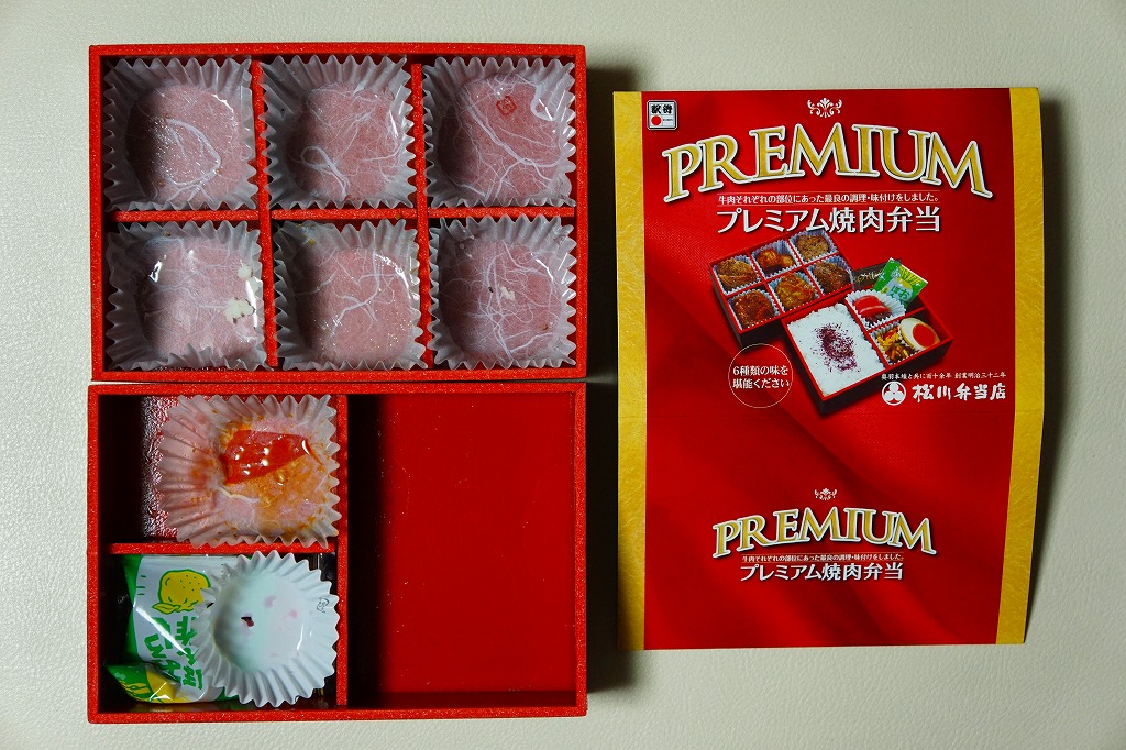 牛焼肉の内訳は、添付のしおりに書かれるとおり、「赤身肉(塩・胡椒)」「サイコロ(塩・胡椒)」「カルビ(塩・胡椒)」「タン(塩・胡椒)」「カルビ(西京風味噌ダレ」「ハラミ(塩・胡椒)」。これらが焼肉の姿のまま、6区画に2個ずつ収まる仕様。常温と高価格が気にならなければ、これはおもしろいつくり。2018年までの販売か。