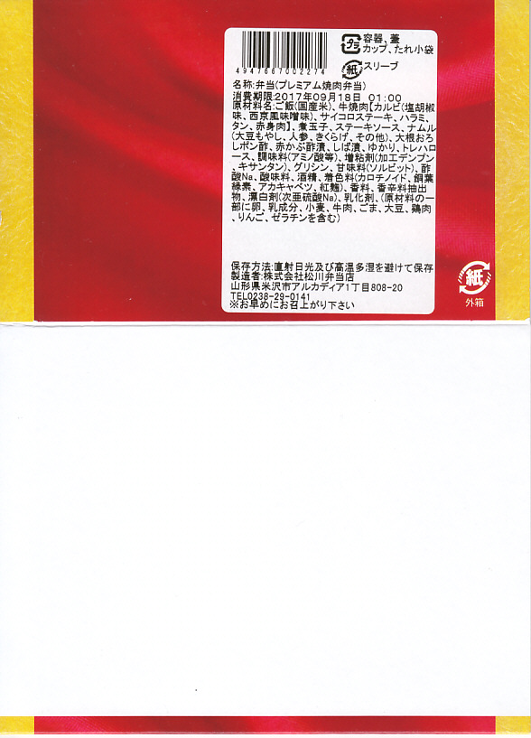 ヒモを引いてから食べるまでの時間が短かったか、熱が肉まで回っていなかったが、常温で食べてもアツアツと変わらなそうな味。最近の駅弁催事で大きな顔をする加熱式米沢駅弁の中でも比較的初期に出たはずなので、常温で味を生かす駅弁屋の技術をベースに作られたのではと思う。2016年時点で現存不詳だったが、2021年時点で要予約商品として調製元が公式サイトに掲載。2021年春に廃盤か。