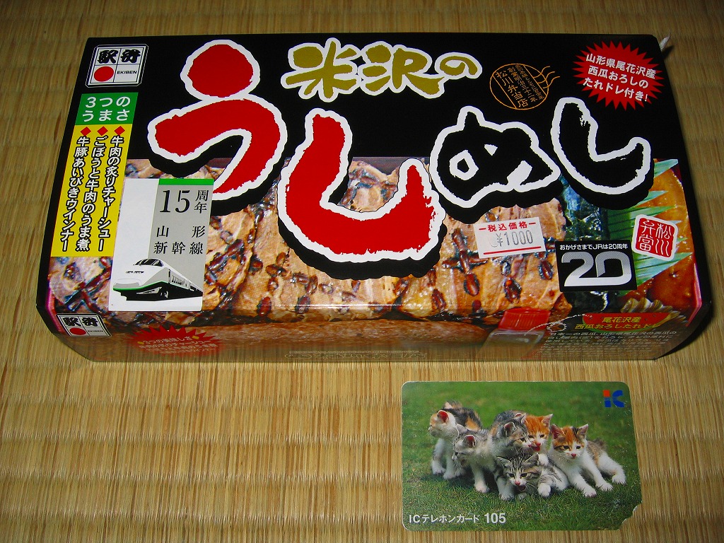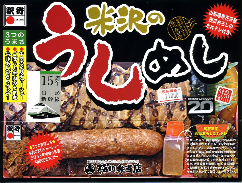 山形新幹線の開業15周年を記念して2007(平成19)年7月に発売した期間限定駅弁とされるが、その前から売られていた模様。長方形のトレー接着容器に黒いふたをして、駅弁の名前と中身の写真や宣伝文句を印刷して山形新幹線15周年シールを貼ったボール紙の枠にはめる。中身は白御飯の上に牛肉うま煮、薄切りの牛肉チャーシュー、牛豚合挽ウインナーを載せ、ごぼうと高菜と味噌しそ巻を添えるもの。