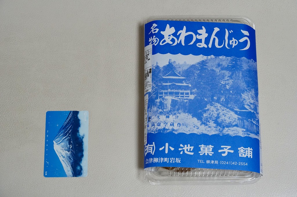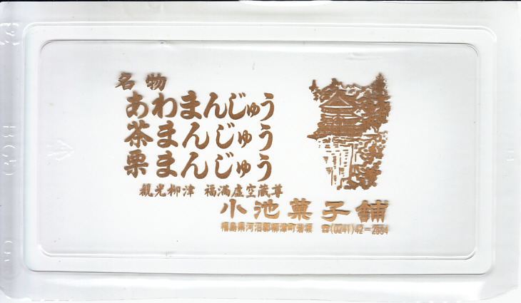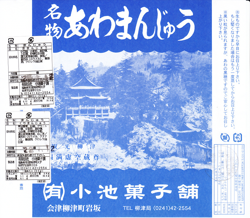 これは駅弁でも駅売り銘菓でもないが、駅名と同じ地名を名乗る郷土の銘菓であり、デパートの駅弁催事や物産展でも積極的に実演販売され、駅弁よりも人気に見える商品。イベントで只見線の会津柳津駅へ売りに来たこともあるらしい。昭和時代の土産物感が満載の掛紙は、観光柳津福満虚無蔵尊と記される圓藏寺(円蔵寺:えんぞうじ)の写真。生地に餅米と粟を使い、中身にこしあんを使う、不思議とみずみずしい、一口サイズの饅頭。今回は京王百貨店の駅弁大会で、あわまんじゅう2個、栗まんじゅう2個、茶まんじゅう2個を組み合わせたら840円だった。