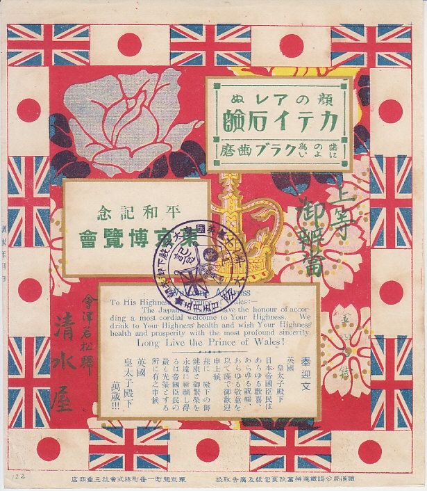 1922(大正11)年の調製と思われる、昔の会津若松駅弁の掛紙。同年に上野公園で開催された平和記念東京博覧会で英国の皇太子殿下が来日されたことを記念して、全国各地の駅弁屋が同じデザインの記念掛紙を使用したもの。周囲に日本と英国の国旗を配し、右に駅弁の名前、左下に調製元、下部に日英の歓迎文、上部の2枠は広告枠。