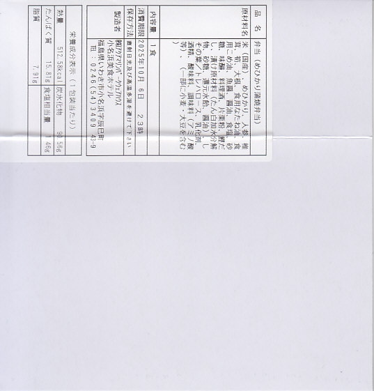 訪問時のいわき駅で3種類見つけた幕の内駅弁のうち、真ん中の価格だったもの。ボール紙に白トレーの折詰容器というスタイルは共通に、そのふたが沿線地図「いわき市観光案内」となる専用のものを使用している。中身は日の丸御飯と、おかずの焼マス・白身魚フライ・玉子焼・蒲鉾・竹輪に煮物類まで共通ながら、ビーフの香りの強い牛肉そぼろ煮が入っているので、おかずが足りなくなることはない。上中下で一番、価格と中身のバランスが取れていると思う。