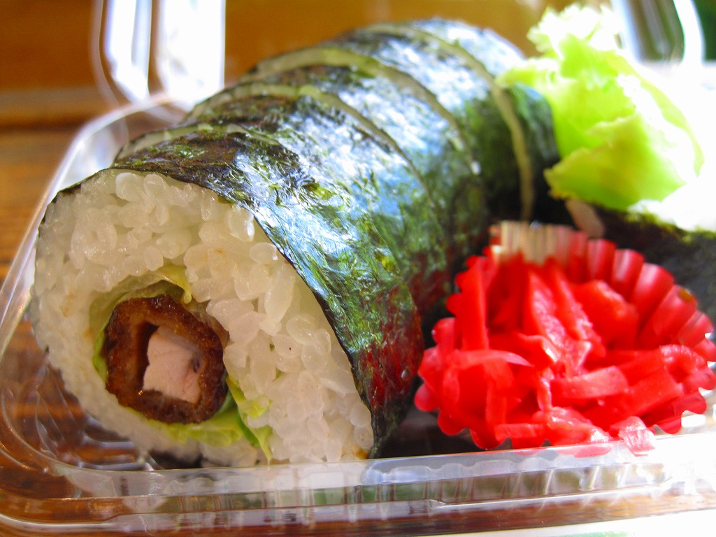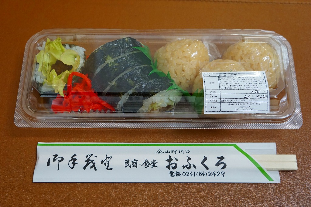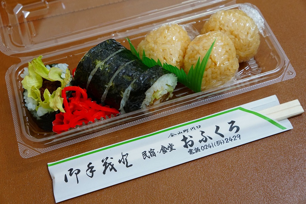 ずんぐりむっくりの海苔巻きが1本分、6切れにカットされて透明なプラ製の惣菜容器に収まる。その中身は、5ミリ角しかないけれどサクサク感が抜群な棒状の甘辛なトンカツを芯に、レタスと白御飯と海苔を巻いたもの。まさかここでこういうものを買えるとは思わなかった。食品表示ラベルによると地元の個人が、箸袋によると民宿・食堂「おふくろ」が調製しているようで、こうやって駅構内の売店に卸してあれば、只見線で唯一の駅弁と呼べるかもしれない。
