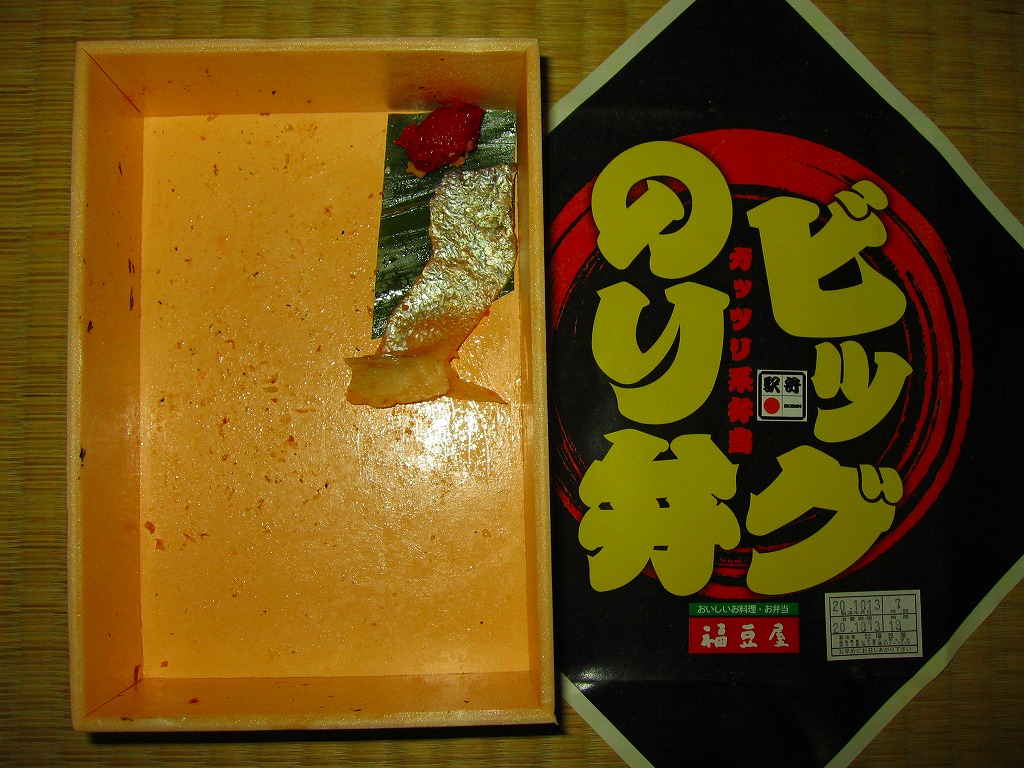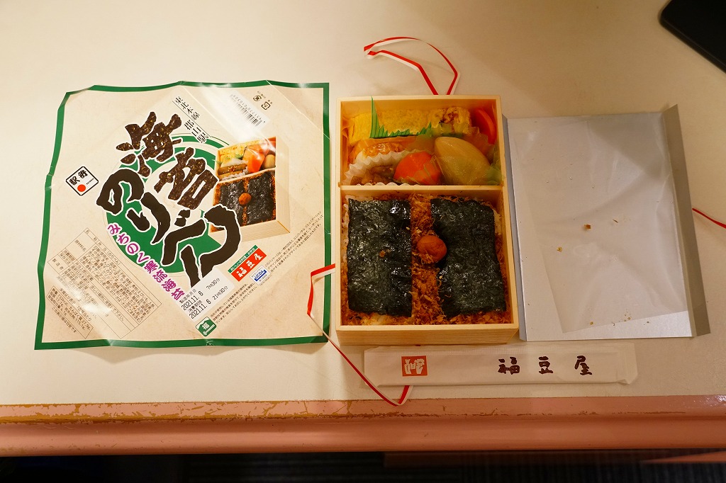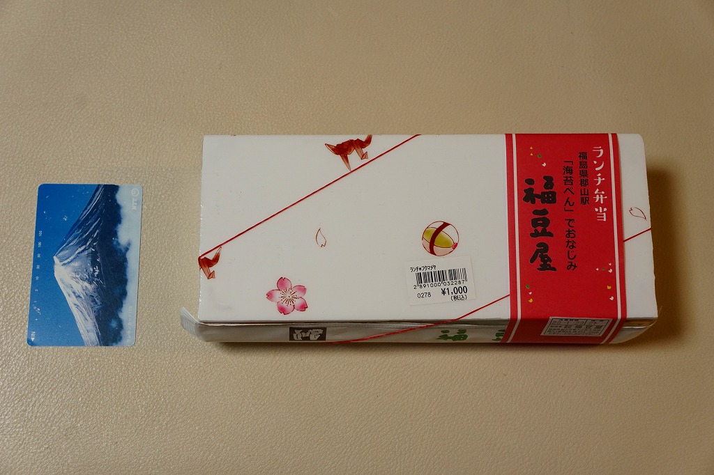 分量が通常版の1.5倍というが、郡山駅の駅弁ではこういう商品を思い当たらない。それでも、地元で仕出し屋や弁当屋としても親しまれているであろう駅弁屋が、ホカ弁の定番メニューであるのり弁当について、大真面目に拡大コピーした爽快な試みは、駅弁イベントを大いに盛り上げるものだろう。現地で売られていても楽しそう。