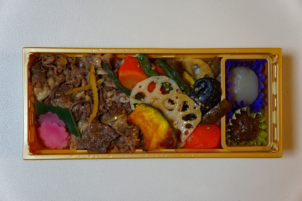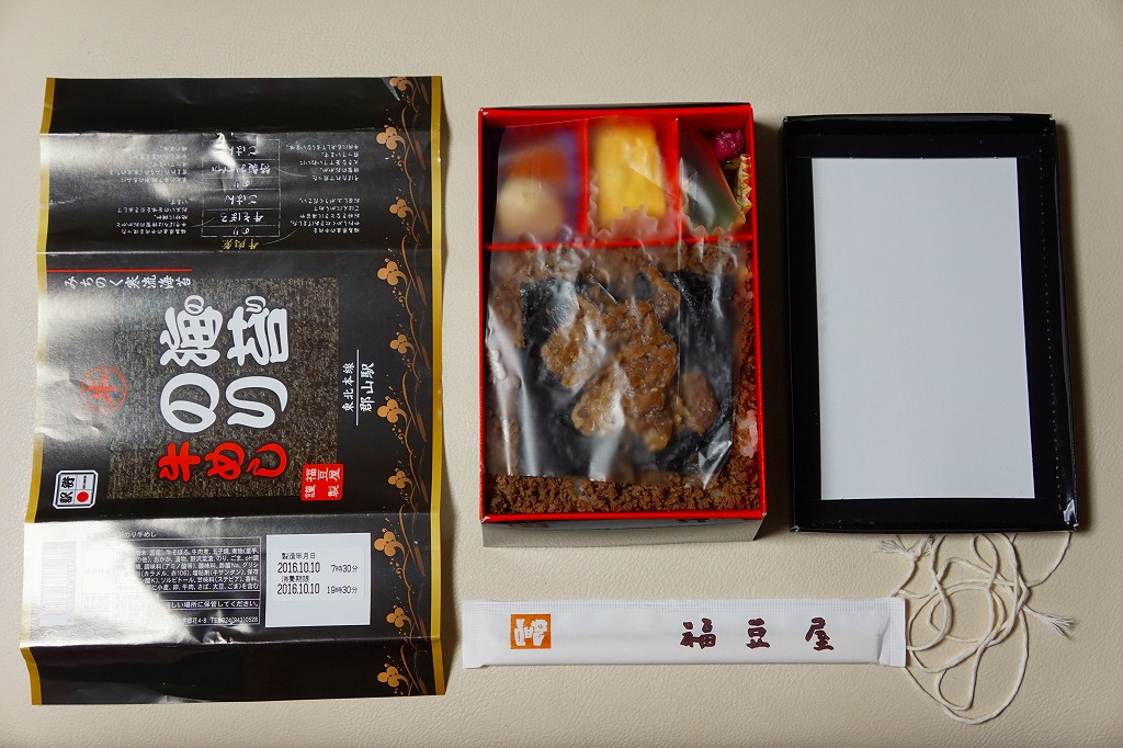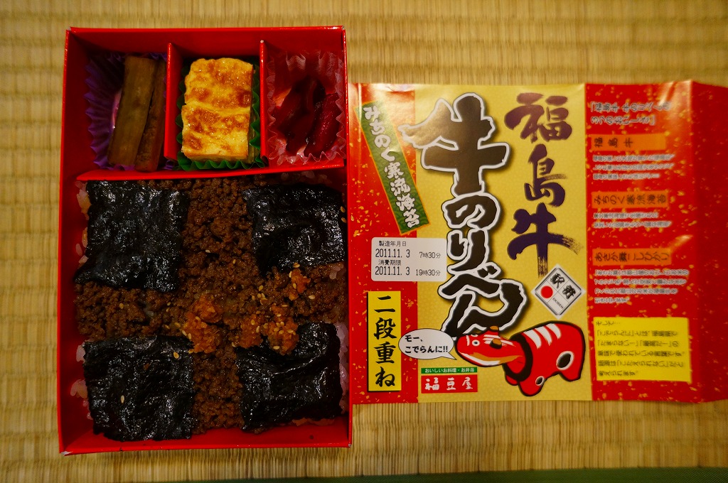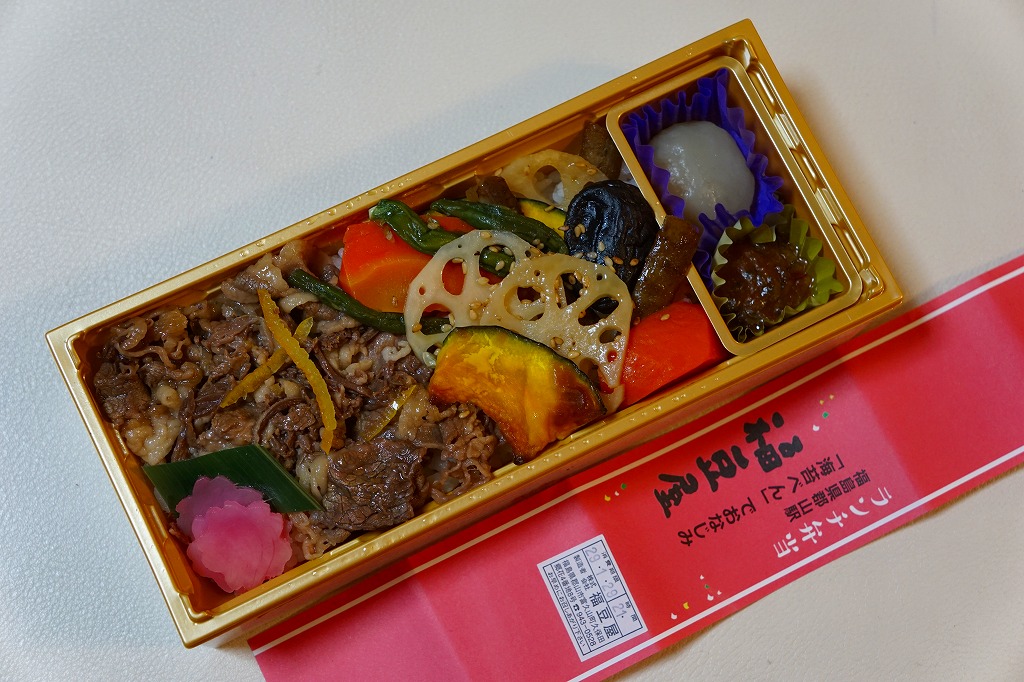 これは商品名のとおり、郡山駅の駅弁屋である福豆屋のもの。御飯を牛肉煮とニンジンやカボチャやレンコンなどで覆う、前週に京王百貨店の駅弁大会で買った「野菜畑の牛めし」と同じものだった。