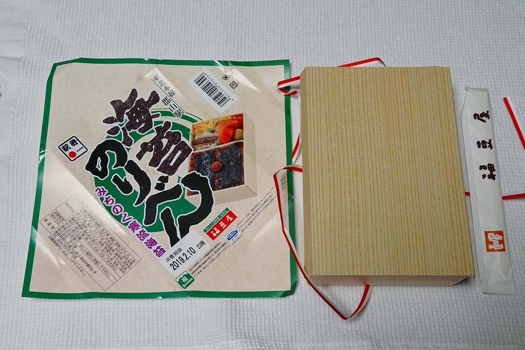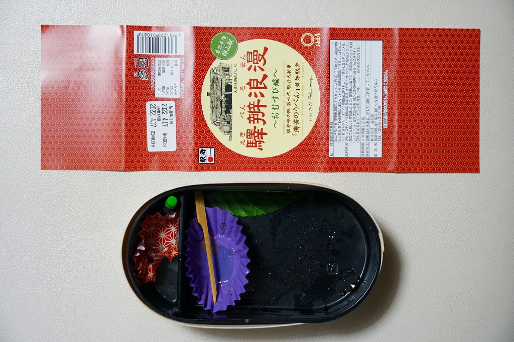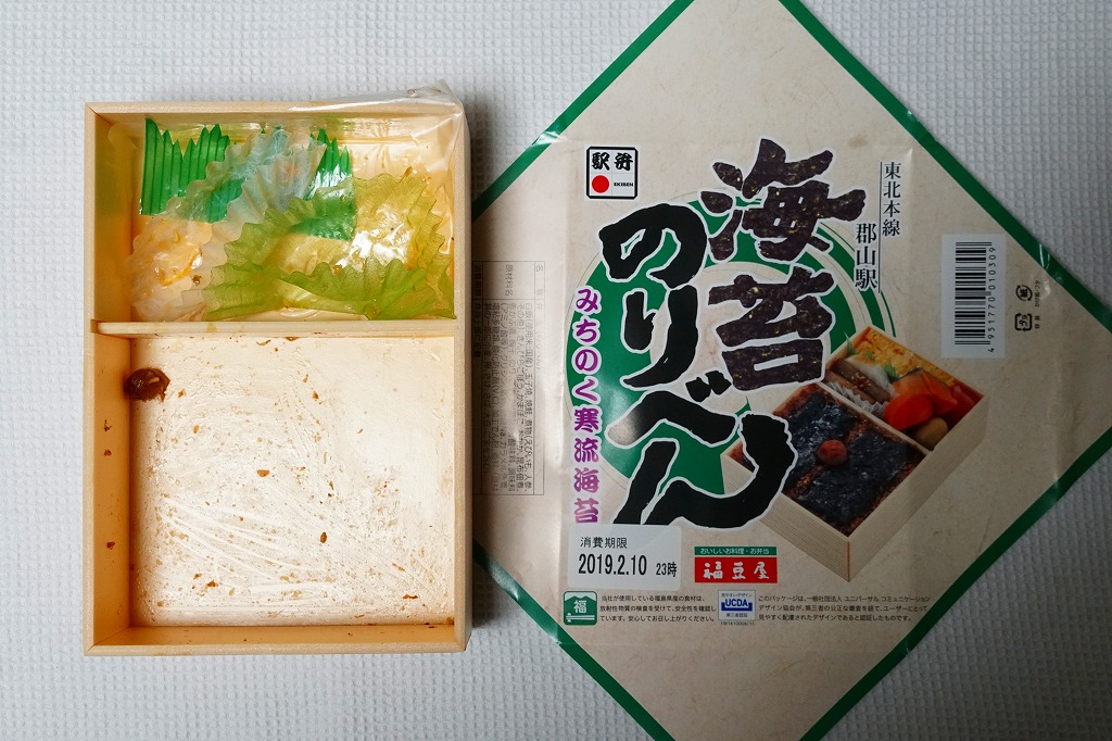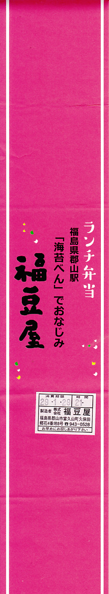 2021(令和3)年1月10日に購入した、郡山駅弁の掛紙。法令の強化で食品表示の文字数が増えた以外は、2年前と変わらない。