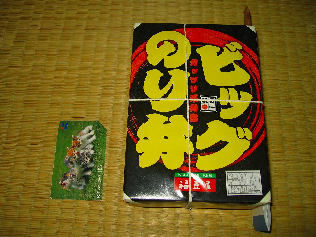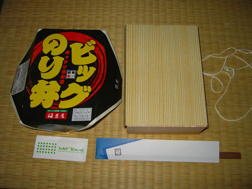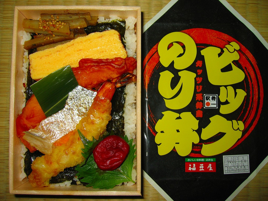 2008(平成20)年10月12日と13日に東京駅で開催された「東日本縦断駅弁大会−秋−」で販売されたお弁当で、全8種が誕生した「メガ駅弁」のひとつ。二段重ねかと思うほどの高さがある木目調の容器にボール紙でふたをして、商品名を力強く描いた掛紙をかけて、ひもで十字にしばる。中身は白御飯を海苔ととりそぼろとカツオブシで3層に重ね、鶏ササミ唐揚、玉子焼、焼鮭、海老天、きんぴら、梅干しなどを載せるもの。具はいずれもビッグで、名は体を表す見事なガッツリ系。