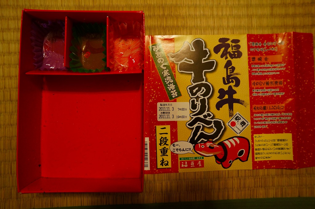 2011年3月5日と6日に東京駅で開催された「“はやぶさ”デビュー記念駅弁大会」でデビューか。赤いボール紙の長方形の容器に黒いふたをして、駅弁の名前と牛べこと宣伝文を描いた赤い掛紙を巻く。中身は郡山産コシヒカリ「あさか舞」の白御飯の上と中に福島牛のそぼろを入れ、海苔を貼り付け、玉子焼とごぼう煮と柴漬けを添えるもの。