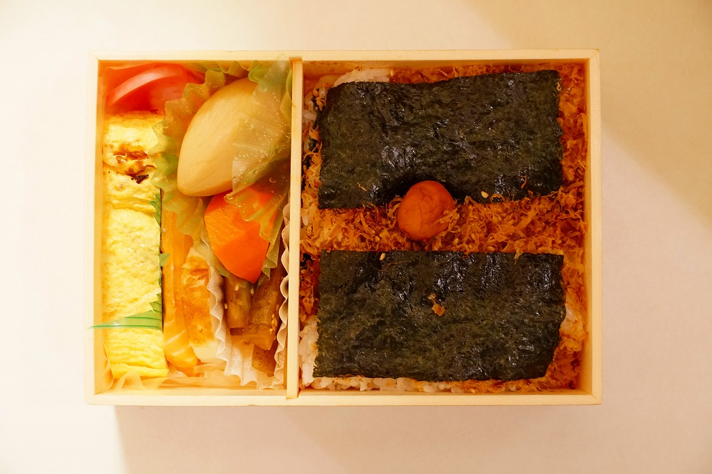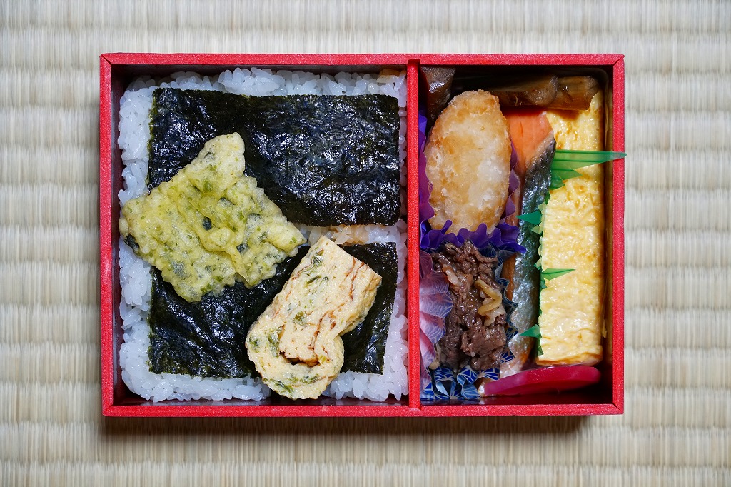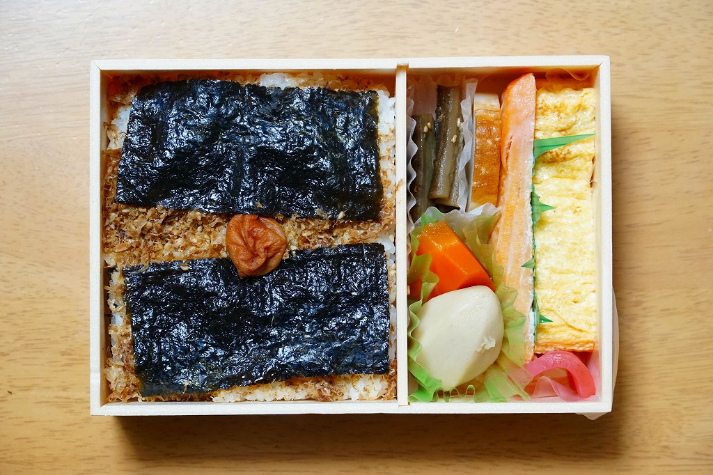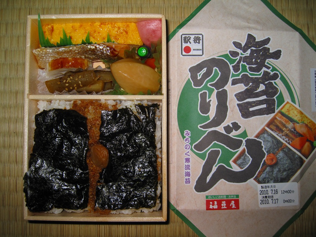 長方形の容器を、駅弁の大きな名前と写真を印刷した掛紙ですっかり覆う。中身は白御飯を詰めて昆布つくだ煮をまぶして海苔を貼り、さらに白御飯を詰めておかかをまぶして海苔を貼り梅干しを載せた、二段重ねの海苔御飯に、大きな玉子焼、焼鮭、大切りのきんぴらごぼう、海老芋、かまぼこ、赤かぶなど。