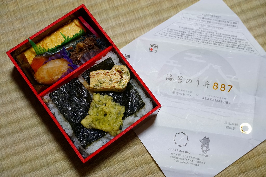 2021年4月から9月までのJRグループの観光キャンペーン「東北デスティネーションキャンペーン」の開催に合わせ、2021(令和3)年4月1日に東京、郡山、福島、新白河、会津若松の各駅で発売。郡山駅を代表する駅弁「海苔のりべん」の新バージョンで、福島県郡山市産「あさか舞」の最高級米「ASAKAMAI887(アサカマイハチハチナナ)」を使い、その数字を駅弁の名前に取り入れた。漆器の木目を印刷した長方形の容器を、「海苔のりべん」のものとは対称的に落ち着いた文字や絵柄やアイコンで構成し、887の文字と調製元の新ロゴマークが金色に光る白い掛紙で包む。