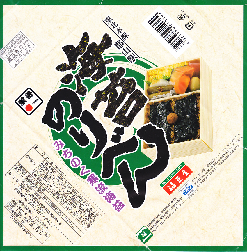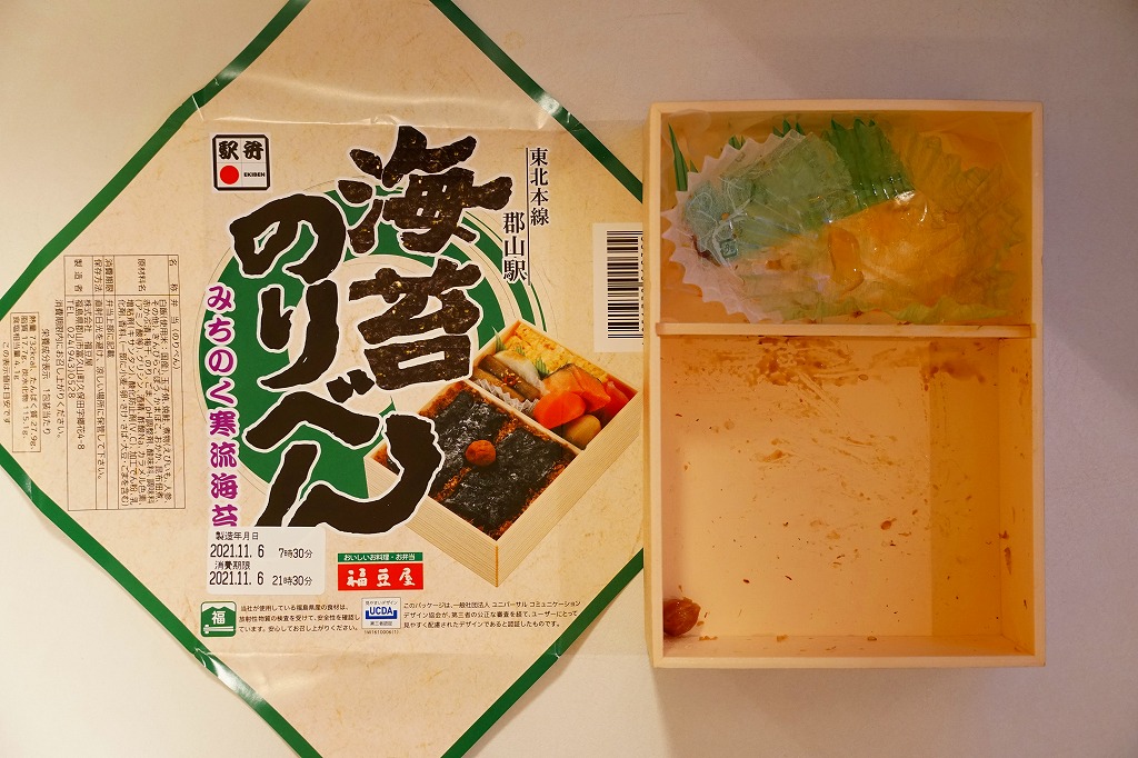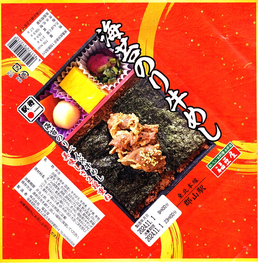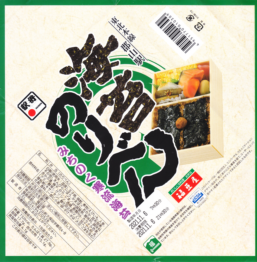 2021(令和3)年11月6日に購入した、郡山駅弁の掛紙。この「海苔のりべん」の掛紙そのものは、上記の2019年に栄養成分表示を加えた程度で、下記の2021年1月のものと変わらない。外圧に負けた今の世に珍しく、消費期限のラベルに製造年月日の表示が復活しており、これには驚いた。