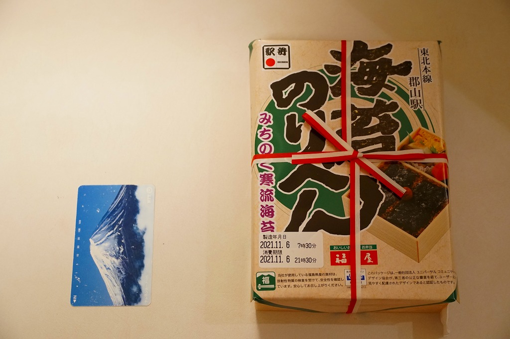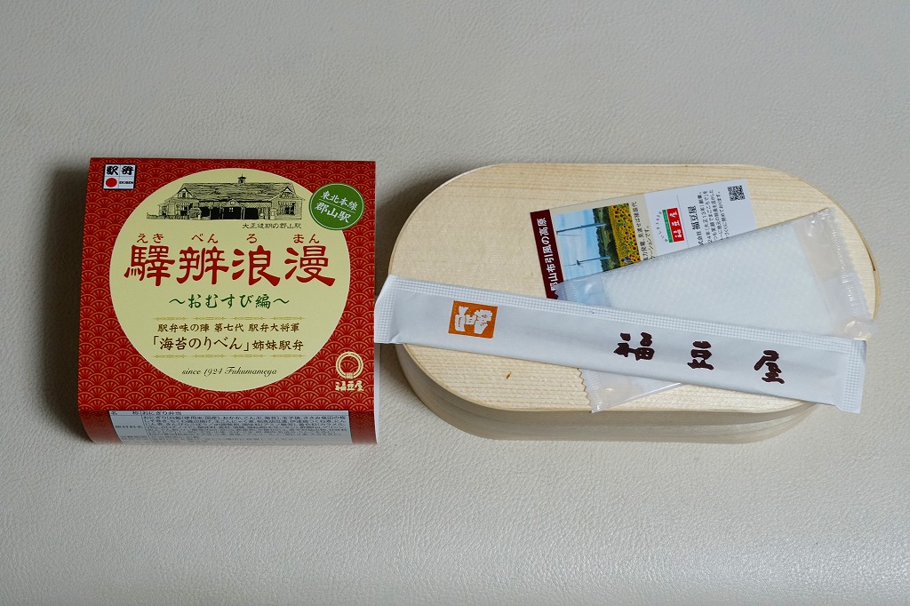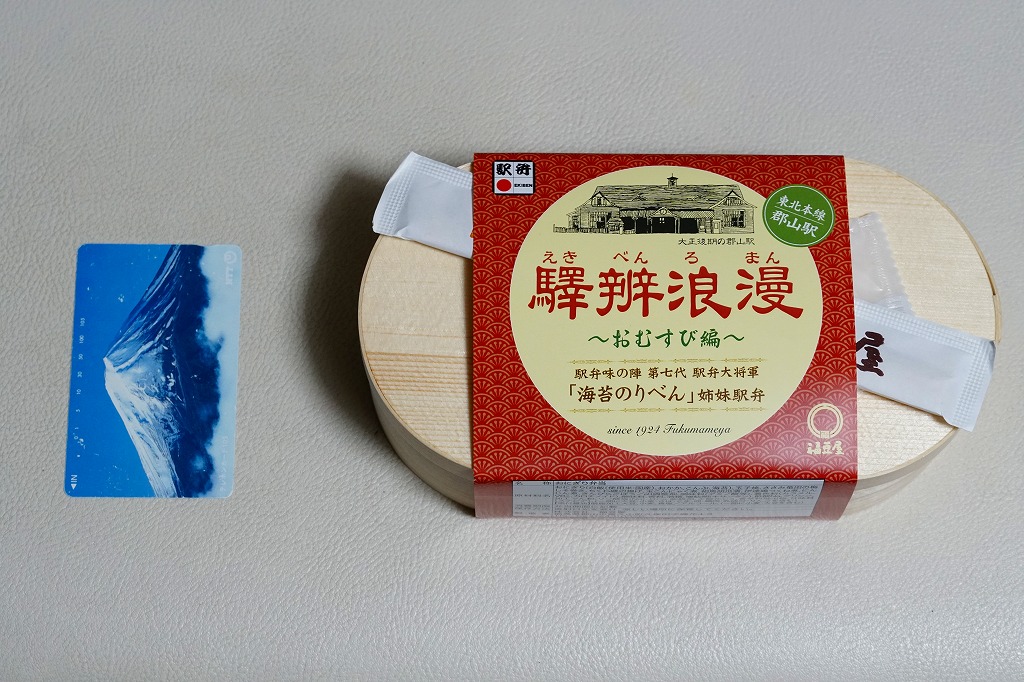 駅弁の名前は新字体で「駅弁浪漫」とも。日本鉄道構内営業中央会が駅弁誕生135周年を記念して、会員のうち21社が2020(令和2)年4月10日から販売した、駅弁の原点であるおにぎりをメインとした記念弁当「駅弁誕生135周年おにぎり弁当」の、郡山駅バージョン。1,200円で5月まで販売されたのち、2022(令和4)年の4月10日から24日まで、駅弁の日に合わせ、日本鉄道構内営業中央会の会員のうち21社が、FMヨコハマのラジオ番組「FUTURESCAPE」とタイアップし、この年の4月10日から各社の駅売店などで販売した、駅弁の日記念のおにぎり駅弁の郡山駅バージョン、加えて「海苔のりべん」姉妹駅弁として、900円で再び販売された。