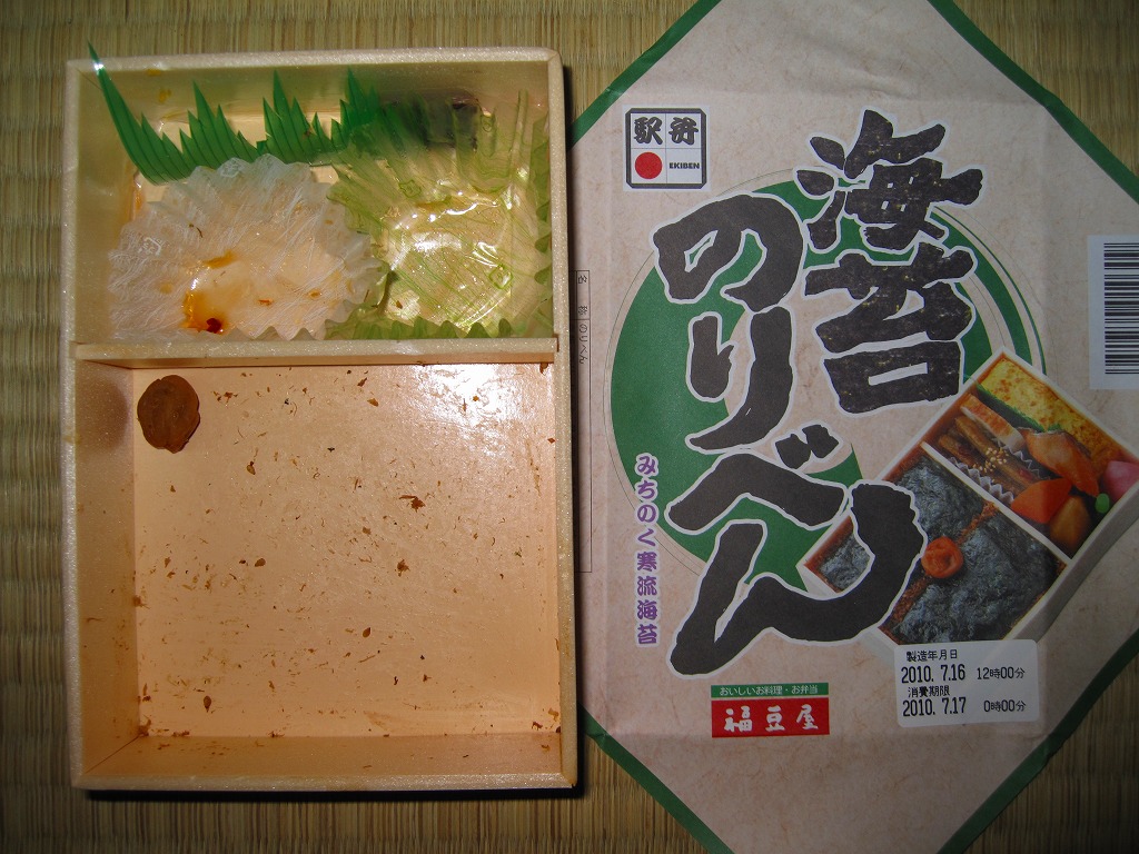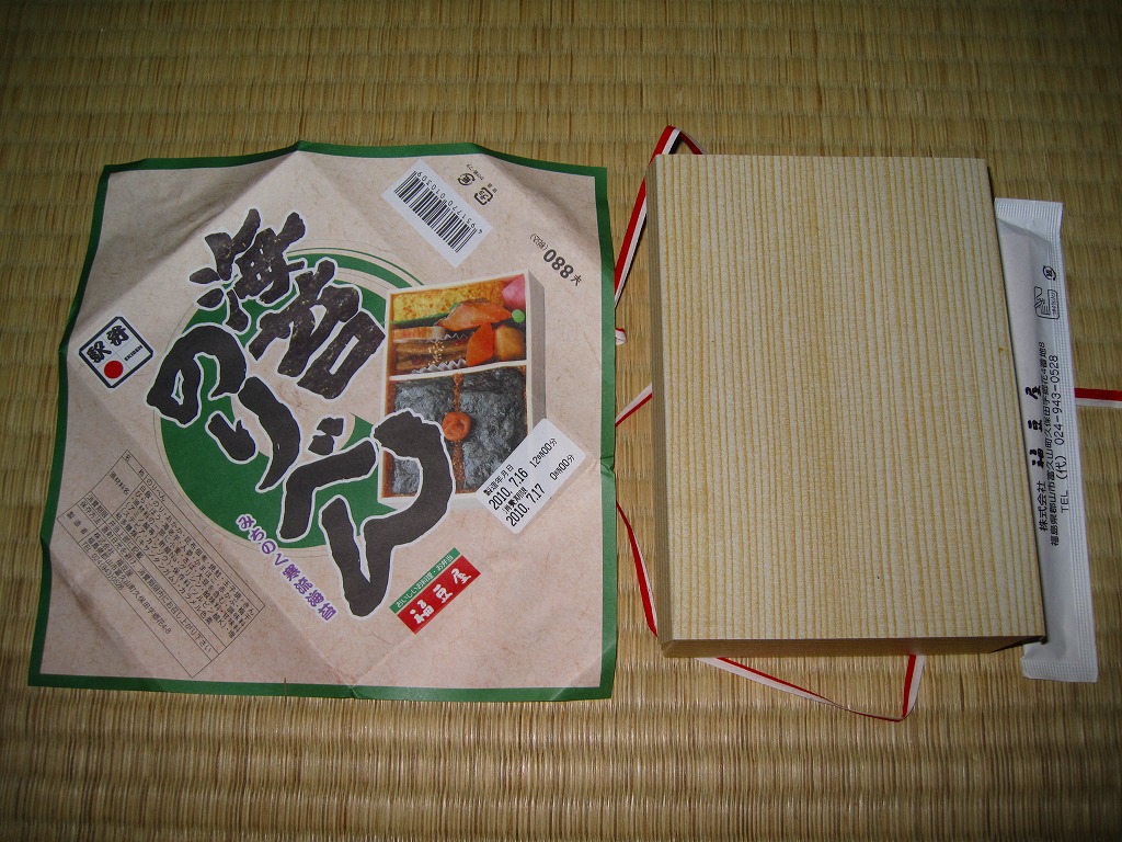 2010(平成22)年7月16日に購入した、郡山駅弁の掛紙。絵柄や中身は上記の2019年のものと同じ。掛紙をよく見比べると、微妙な差はある。