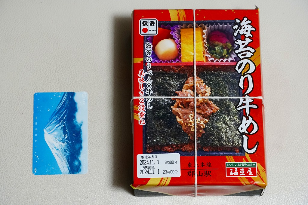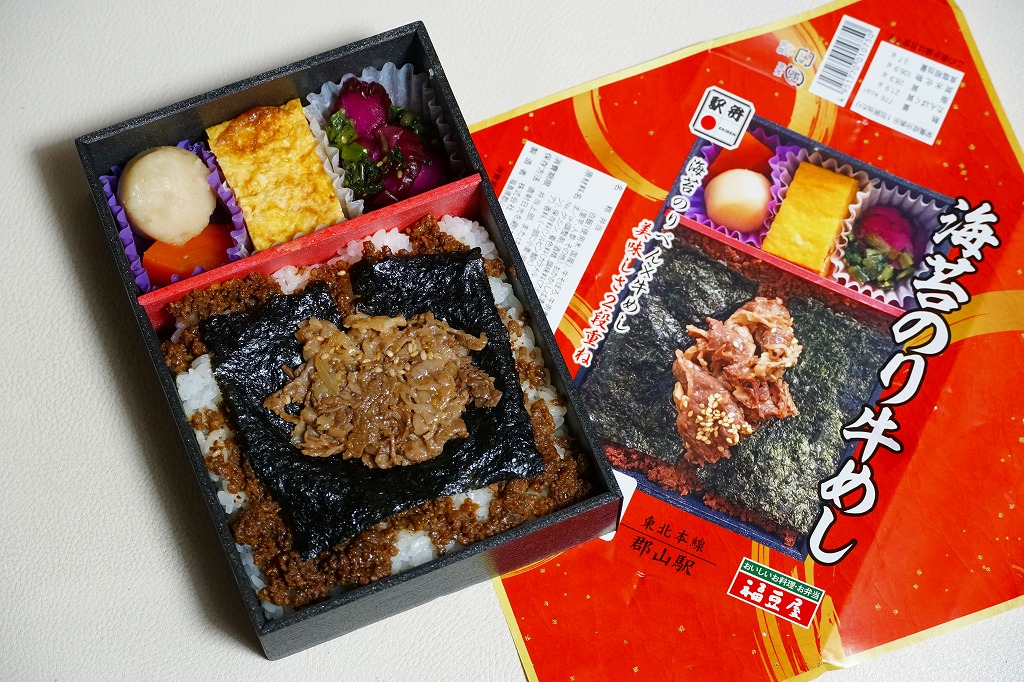 2016(平成28)年9月20日の発売。翌10月にJR東日本の駅弁キャンペーン「駅弁味の陣2016」にエントリー。その名のとおり、郡山駅の人気駅弁「海苔のりべん」の姉妹品だろう。2024年3月に下記の黒いものから写真入り赤色のものへ変わった掛紙をかけた、真っ黒な長方形の発泡材容器で、白御飯の上におかかを載せ、海苔で覆い、白御飯を載せ、牛そぼろと海苔で覆い、牛肉煮で覆う、御飯と海苔のサンドイッチ。これに玉子焼、煮物、漬物を添える。濃いめの味は美味くても、これではただの牛肉駅弁なので、東京駅での大注目を再び、とはいかないかもしれない。価格は2016年の発売時で1,150円、2020年時点で1,200円、2023年時点で1,300円、2025年時点で1,400円。
