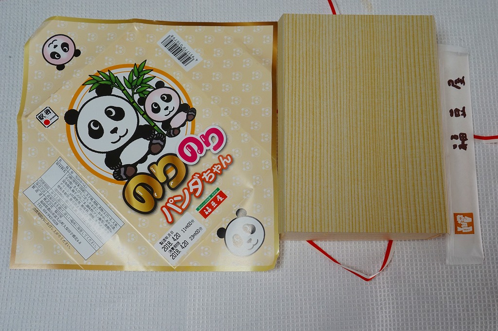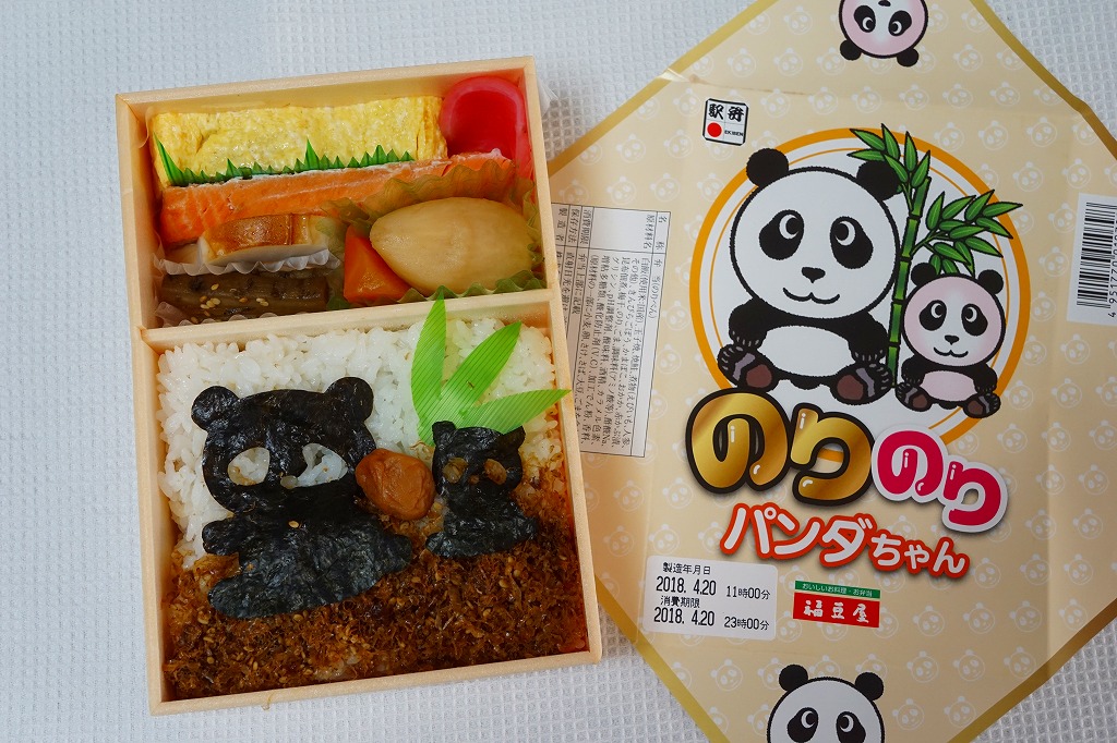 2018(平成30)年3月の発売。中身は東京で人気が出た郡山駅弁「海苔のりべん」と同じく、白御飯を詰めて昆布つくだ煮をまぶして海苔を貼り、さらに白御飯を詰めておかかをまぶして海苔を貼り梅干しを載せた、二段重ねの海苔御飯に、大きな玉子焼、焼鮭、大切りのきんぴらごぼう、海老芋、かまぼこ、赤かぶなど。その海苔の形状が大小の、おそらく親子のパンダ型になっている。掛紙は海苔のりべんの硬派なものとは対極的な、親子の二頭身パンダの目が垂れるゆるーい絵柄。半年間ほどの販売か。