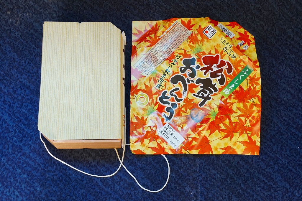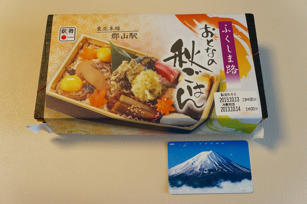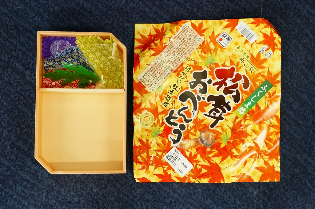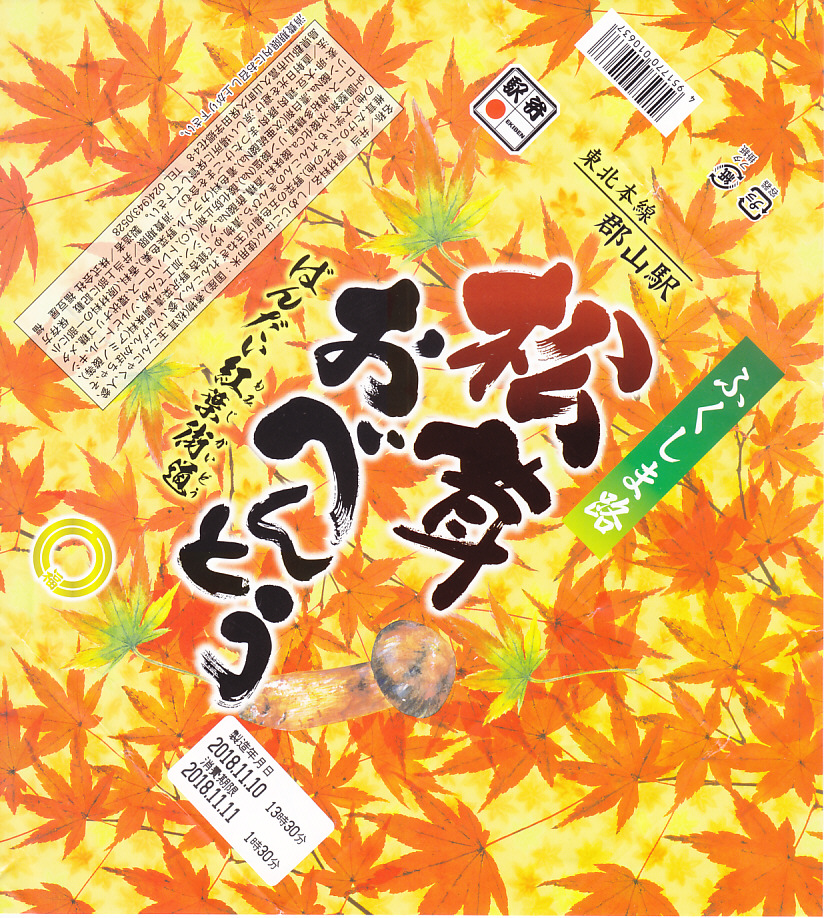 2013(平成25)年10月13日に購入した、郡山駅弁の掛紙。上記の2023年のものと、絵柄は異なるが、主旨は変わらない。中身もまた然り。長方形のプラ容器にシメジ御飯を詰め、クリとニンジンとマツタケで彩り、サトイモとエビとマイタケの揚げ物、カマボコと玉子焼、きんぴらごぼう、つくね、こんにゃくなどを添えた。