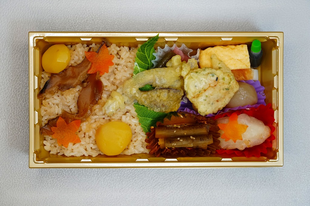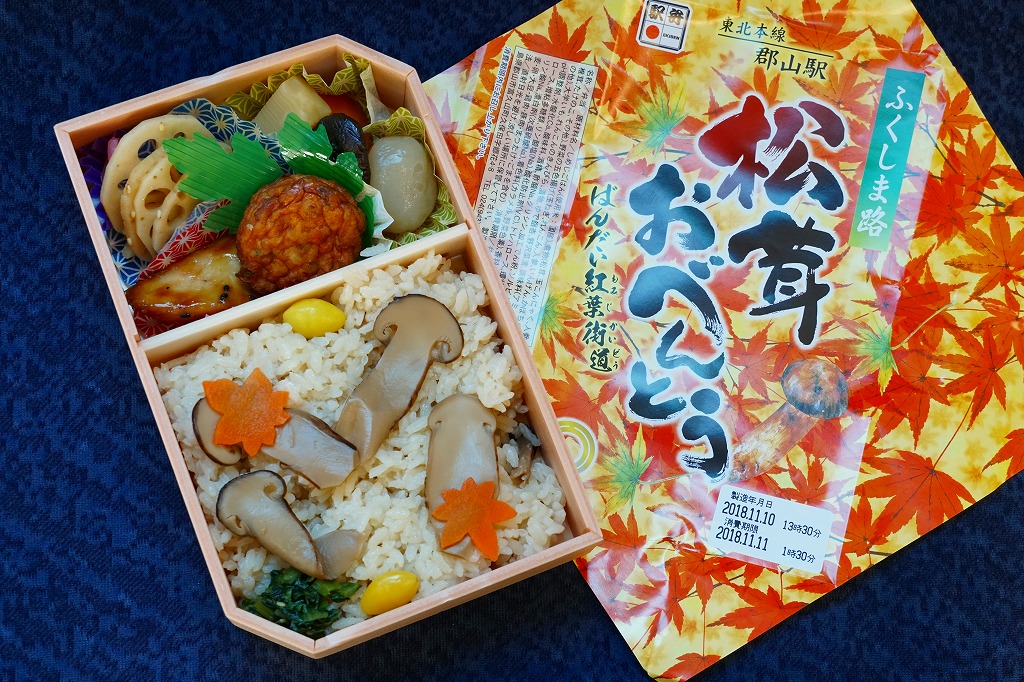 久々に見たような気がする、郡山駅のマツタケ駅弁。2014(平成26)年からこの姿で出ていた模様。秋の色と柄が豊かな掛紙に包まれた容器に、マツタケを載せたシメジ御飯、ニンジンやこんにゃくなどの煮物、野菜の五色揚げ、大学芋、れんこんのきんぴら、漬物を詰める。以前の野暮さや地味さはなく、マツタケは良い意味で目立たない印象。9月から11月までの販売か。価格は2015年時点で1,000円、2018年の購入時で1,050円、2020年時点で1,080円、2023年時点で1,100円。