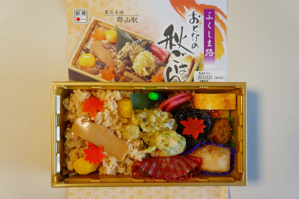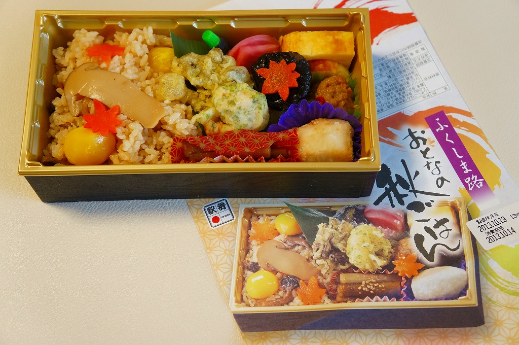 JR東日本の駅弁キャンペーン「駅弁味の陣2013」へのエントリーに向けて、2013(平成25)年の夏までに発売。長方形のプラ容器に茶飯を詰め、クリとニンジンとしいたけで彩り、サトイモとエビとマイタケの揚げ物、カマボコと玉子焼、きんぴらごぼう、つくね、こんにゃくなどを添える。掛紙写真や実物の見栄えのとおり、うまくないはずがないという感じ。「福の島おとなの幕の内」に続き、ここでも駅弁の名前に使った「おとなの」とは何だろうかと思う。価格は2013年の発売時で1,000円、2018年時点で1,100円。