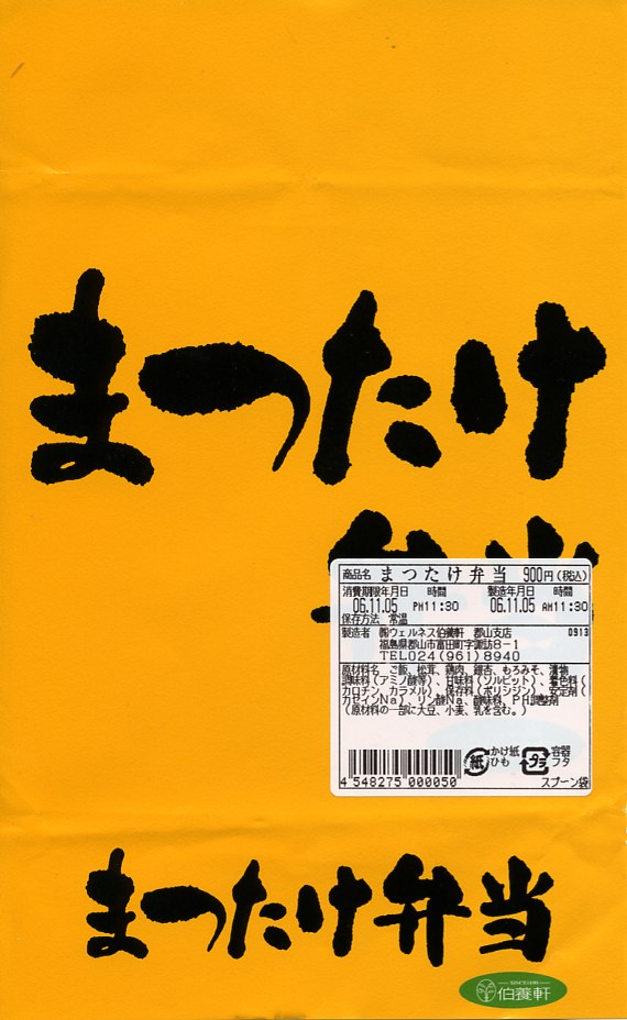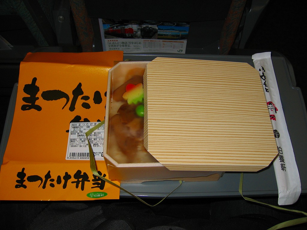 内容的に異色で、松茸の分量も比較的多い松茸駅弁なのだが、ふたを開けると辛味噌と柴漬けの刺激臭が漂い、松茸は鳥そぼろの強い味付けに負けて香りが飛んだ。属地不詳な掛紙でも、商品名を隠すようにべったり食品表示ラベルを貼るのも気になる。どこを切ってもつくりが雑な、がっかり駅弁。2015年時点で現存しない模様。