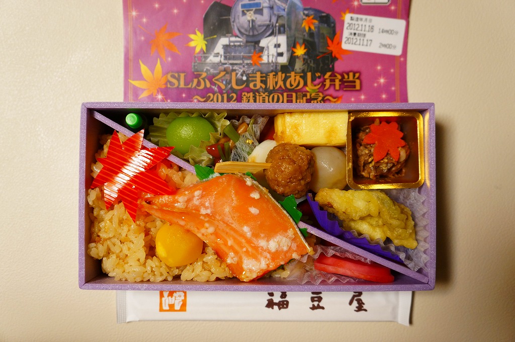 2012(平成24)年10月27,28日に只見線の会津若松駅と会津川口駅との間で運転された「SL只見線奥会津号」の運転に合わせて販売した郡山駅弁とされ、掛紙には10月14日の「2012鉄道の日記念」と書かれていたりするが、どうもこの商品は11月の東京駅の駅弁売店「駅弁屋 祭」と、翌年1月の京王百貨店の駅弁大会でしか売られていないのではと思われる。掛紙のSL写真(おそらくC11325)の正面ナンバープレートをなぜか塗りつぶしている点にも妖しさを感じる。