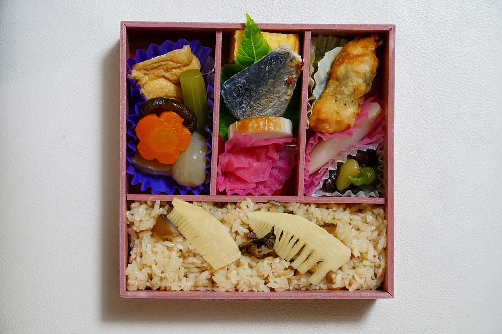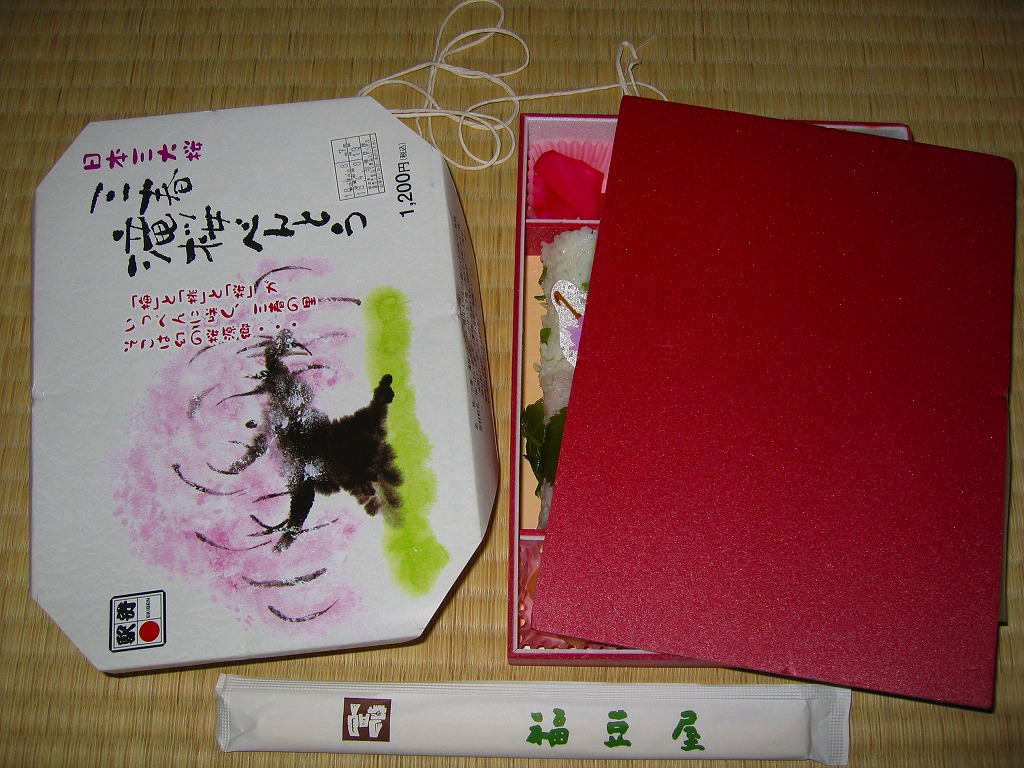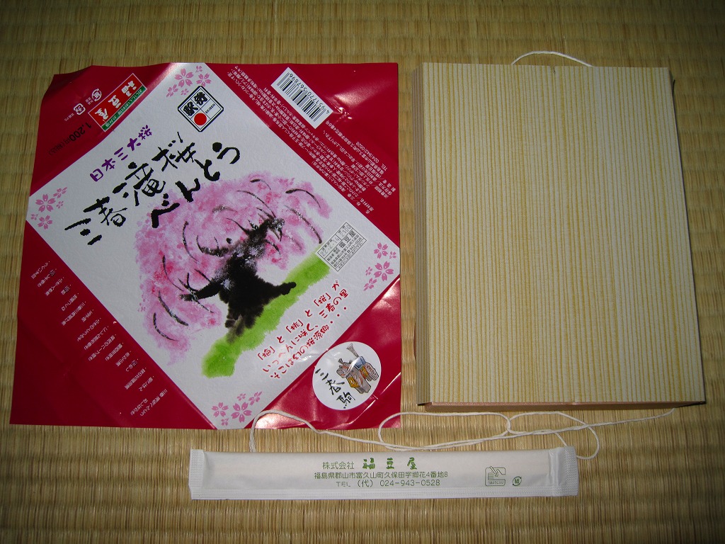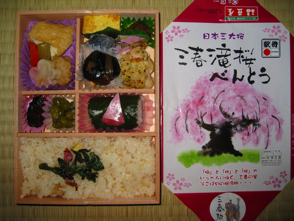 上記の駅弁「三春滝桜べんとう」の、2010(平成22)年時点での姿。タケノコ御飯と菜の花、桜めしと赤かぶ漬、玉子焼と鶏肉ハーブ焼とニシン昆布巻とサワラ西京焼にふきのとうみそ、鶏つくねとニンジンや三角揚げなどの煮物、桃しそ巻きにうぐいす豆などという中身であった。滝桜を使う掛紙の絵柄も異なる。当時はスーパーの駅弁大会での販売もあった。