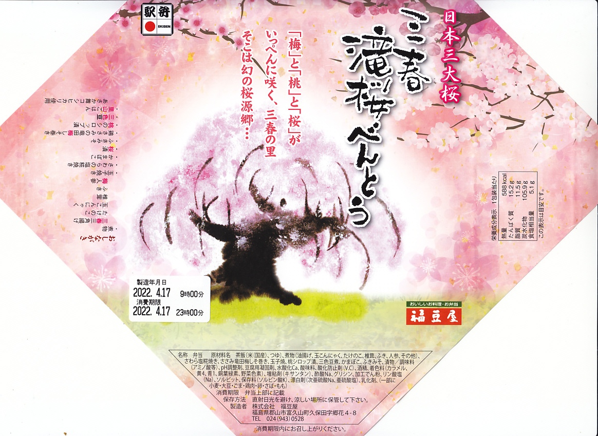 2006(平成18)年に発売。2月下旬から5月のゴールデンウィークの頃まで販売される、春限定の駅弁。駅弁の名前となる三春の滝桜が、大きめの容器を包む正方形の掛紙に大きく描かれる。中身は毎年同じではないようで、今回の2022年のものは、「里山ごはん」とする郡山米あさか舞コシヒカリの炊込飯にタケノコを並べ、こんにゃくやシイタケなどの煮物、玉子焼とサワラ塩麹焼とかまぼこの焼き物と漬物、鶏ささみ竜田揚、桃のシロップ煮、三色豆などのおかずを3列に収める。これは花見ができそうなお料理弁当。価格は2006年の発売時で1,200円、2011年から1,000円、2015年から1,050円、2020年から1,080円、2023年から1,100円、2025年から1,200円。