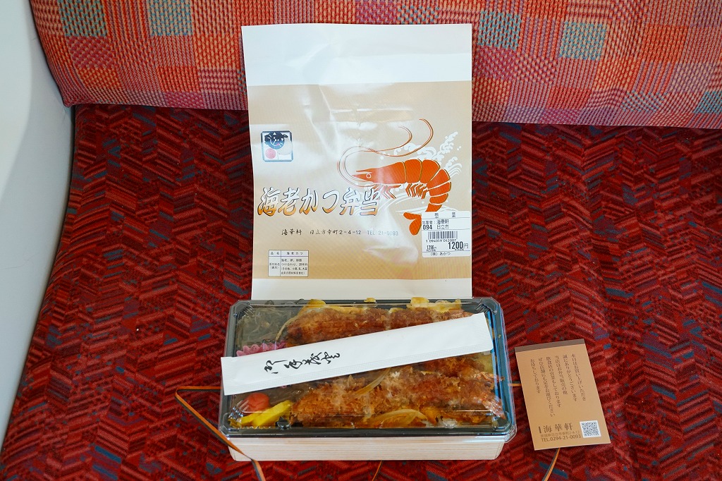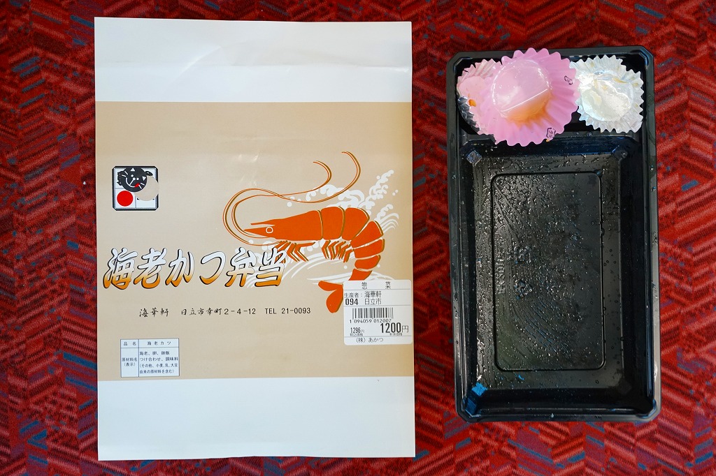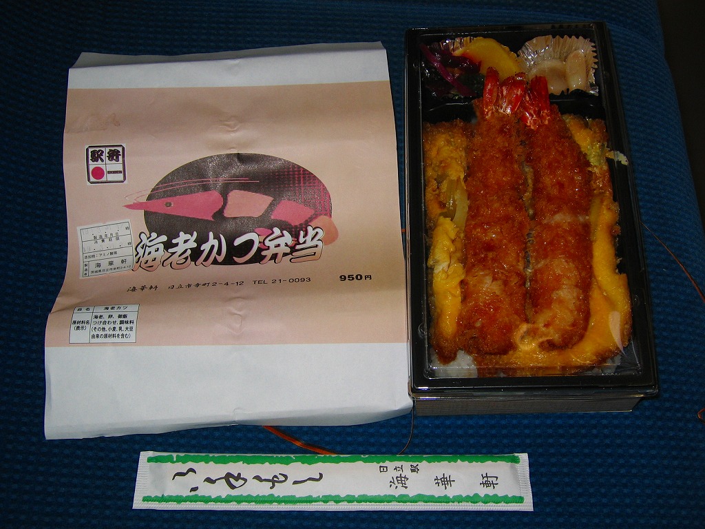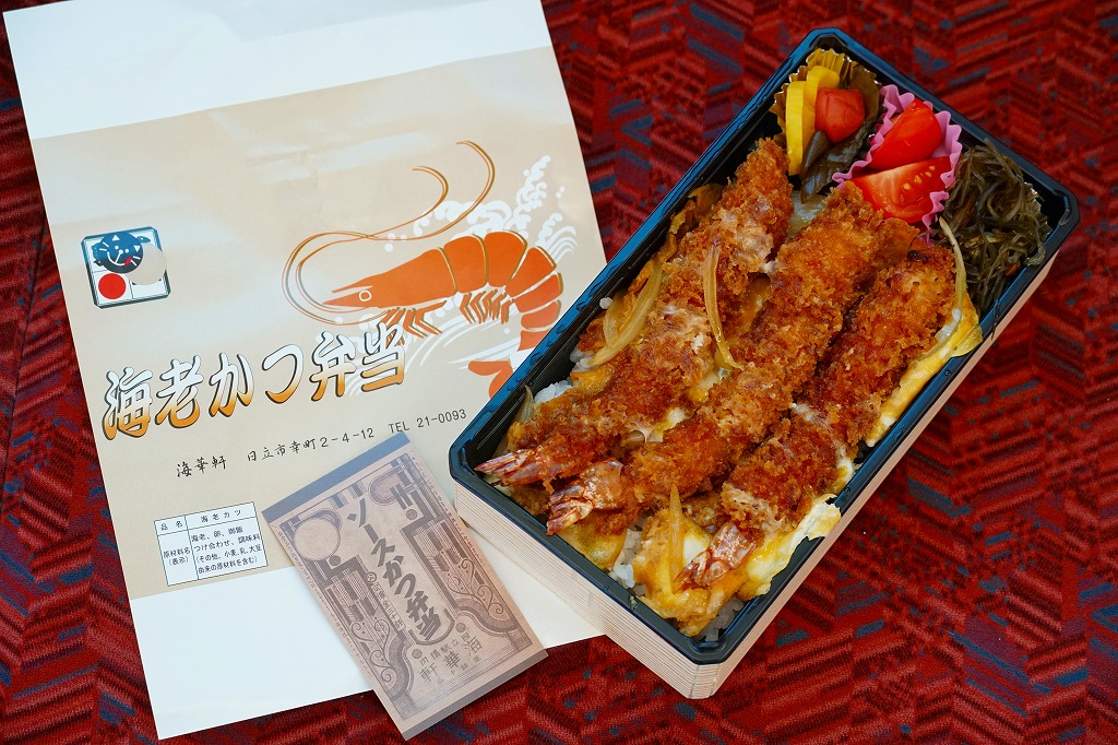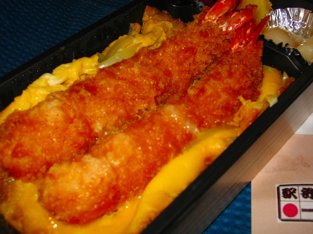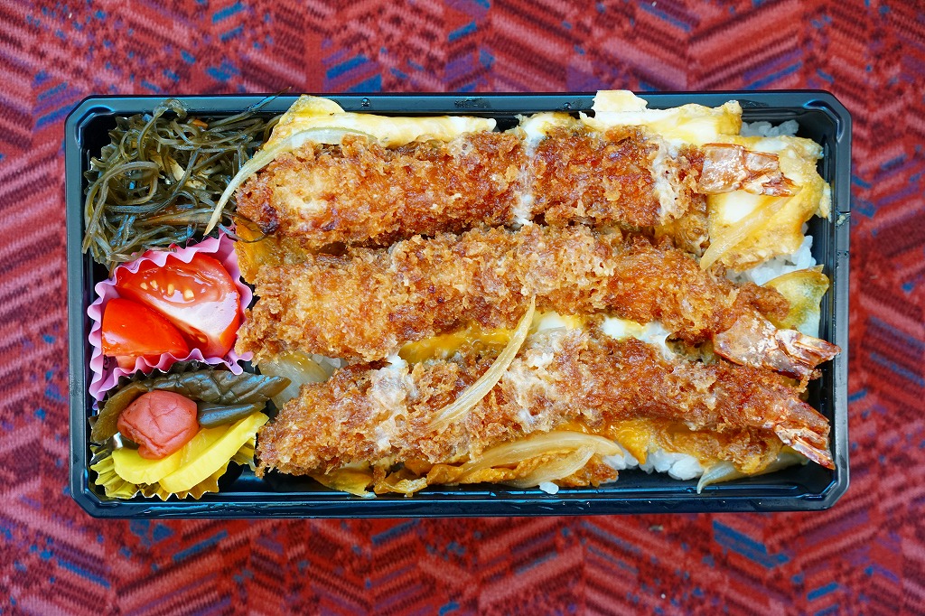 海老と商品名を描く赤基調の掛紙は、駅弁として駅で売られた当時のものが使われ、駅弁マークがシールで隠される。長方形のプラ容器に白飯を詰め、海老フライの卵とじを3尾も並べて覆い、ミニトマト、海藻、梅干しときゅうりとたくあんで3種の漬物を添える。プリプリのエビたっぷり、海老天丼にソースカツの衣を付けたような、卵とじで衣の味が柔らかく、モリモリ食べておいしいお弁当。