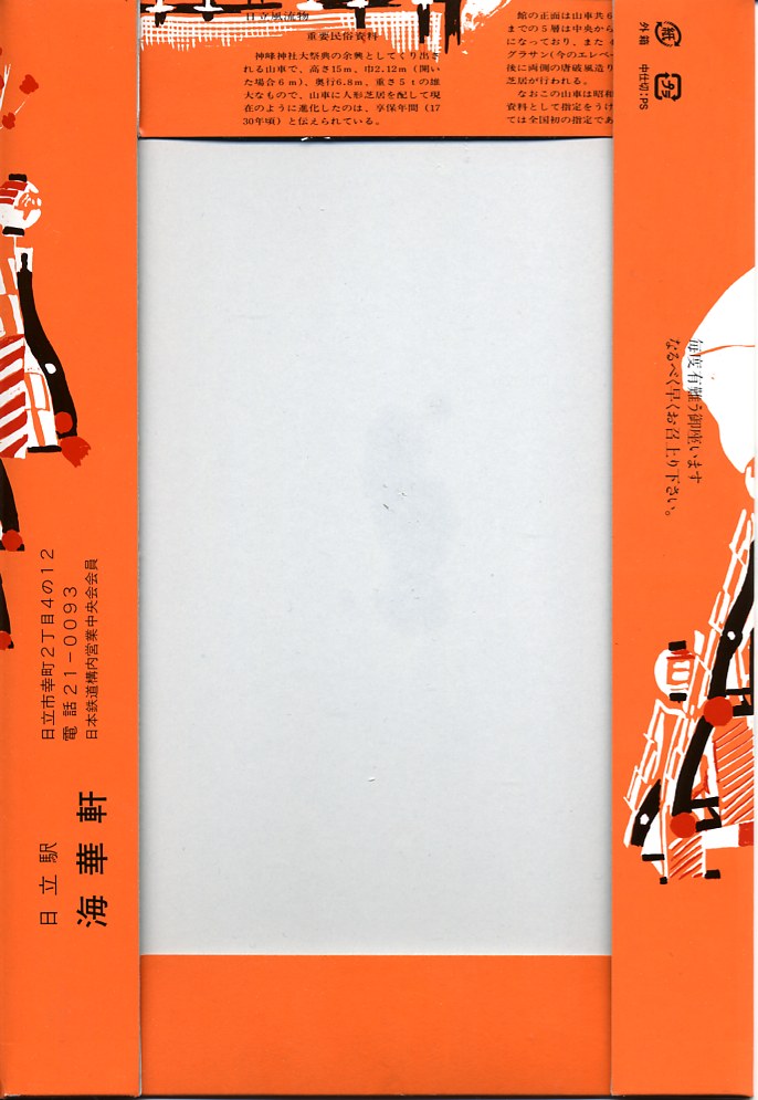 上野駅から特急ひたちで約100分。日立市は茨城県の北東部で太平洋に面した、人口約17万人の工業都市。20世紀に日立鉱山から鮎川財閥が生まれ、鉱山機械修理から日立製作所が生まれ、日本有数の工業都市となった。駅弁は1927(昭和2)年から2008年まで売られた。当時の駅弁の一部が駅前で生き残る。1897(明治30)年2月25日開業、茨城県日立市幸町一丁目。