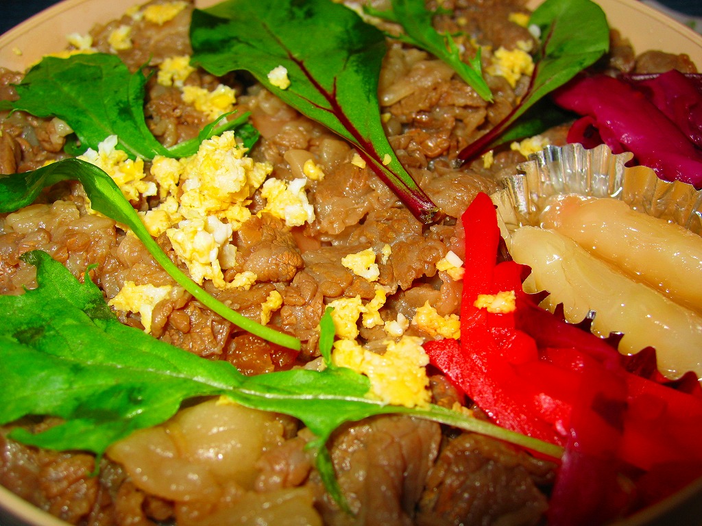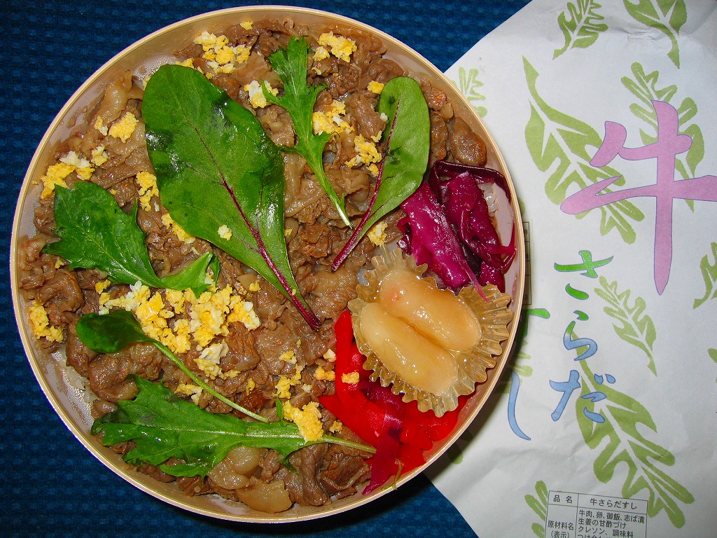 2005(平成17)年の夏までに発売か。上記の駅弁「ソースかつお弁当」と同じ、丸いプラ容器に酢飯を詰め、甘酢生姜を敷いて牛肉煮で覆い、炒り卵をまぶしてクレソンを貼り、紅生姜などを添える。個人的に肉寿司は好みでないが、これはテリの美しさや色彩の良さで見た目に優れ、おそらく個々の食材の品質及び組合せも優れ、しかも個性的。名前も分量も値段も良い感じ。