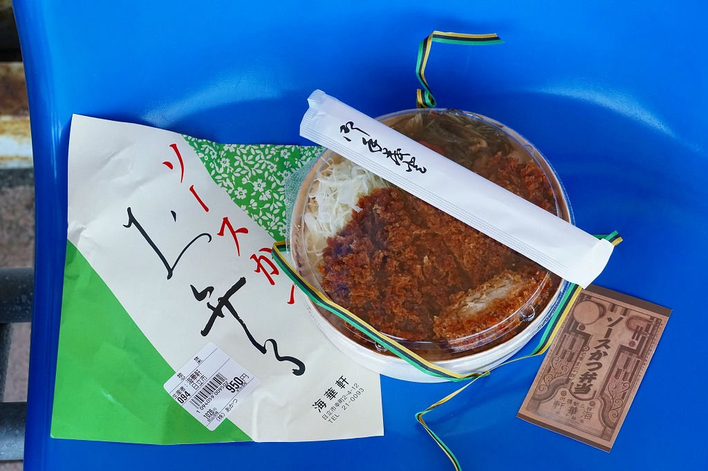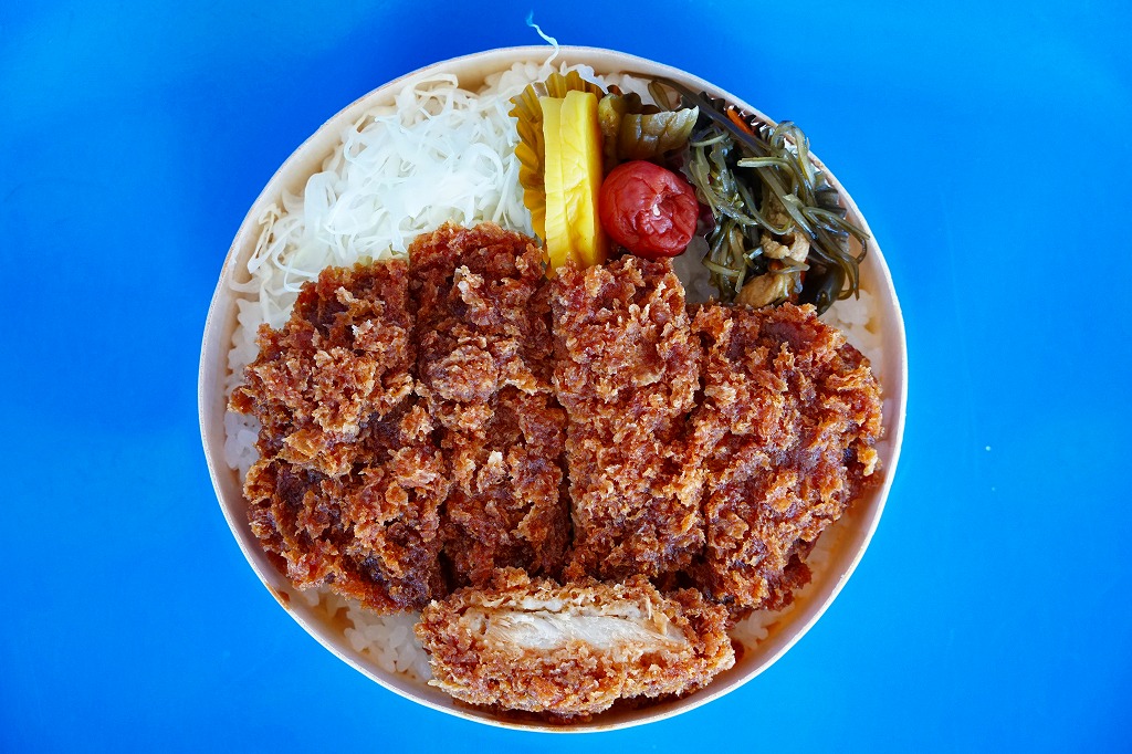 真ん丸の容器に白飯を詰め、ロースカツのソース漬けで覆い、千切りキャベツ、海藻、梅干しときゅうりとたくあんで3種の漬物を添える。サクサクのトンカツは見た目に違い、軽やかな食感と淡めに感じる味付けや肉質で、多めの白飯が進む。これはうまいお弁当。