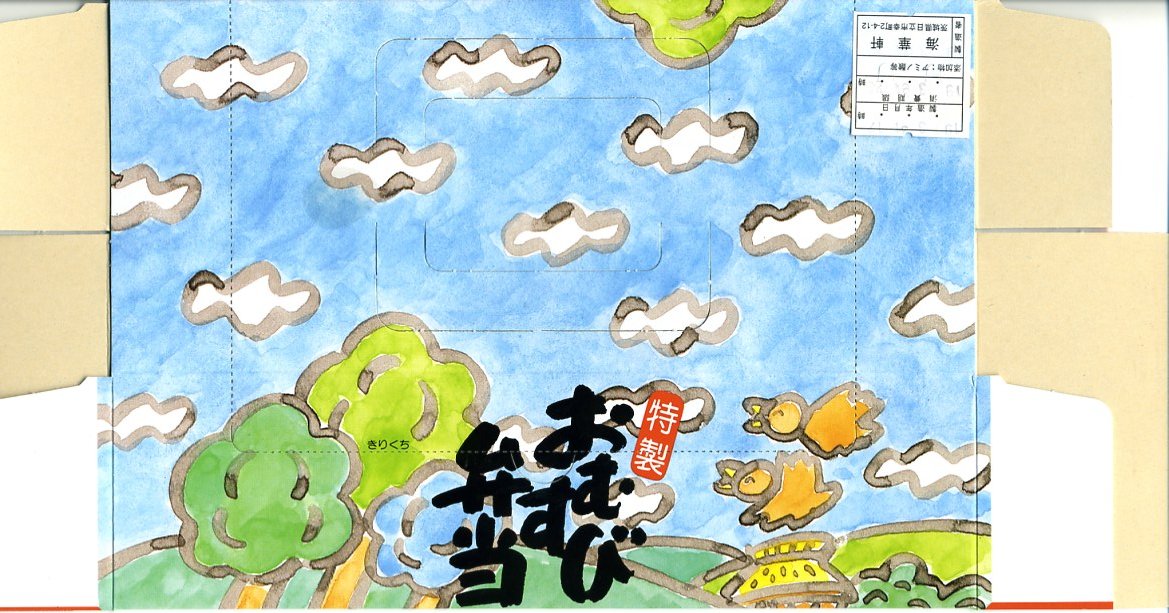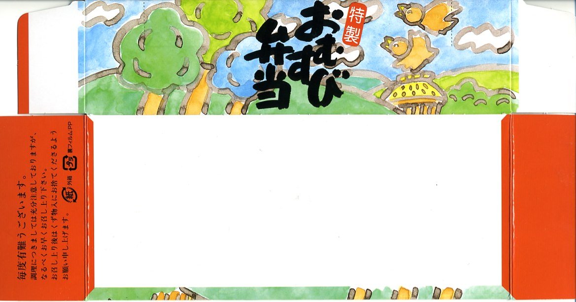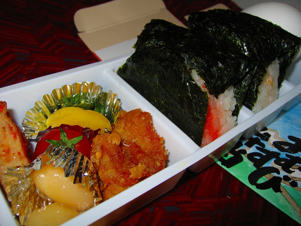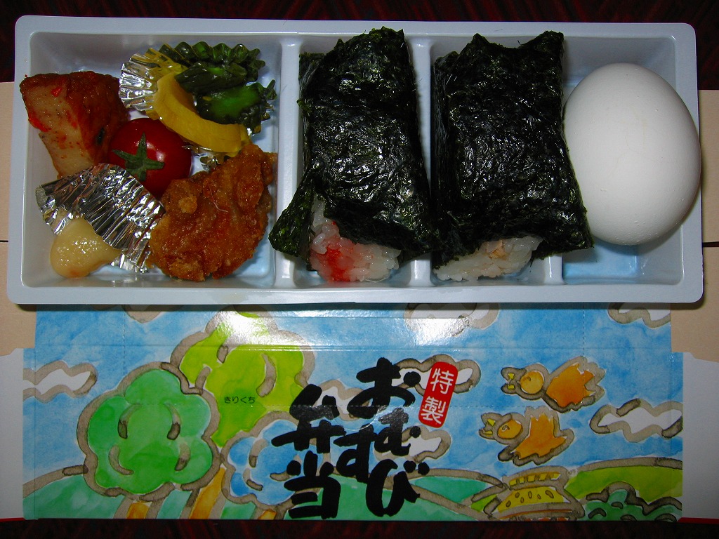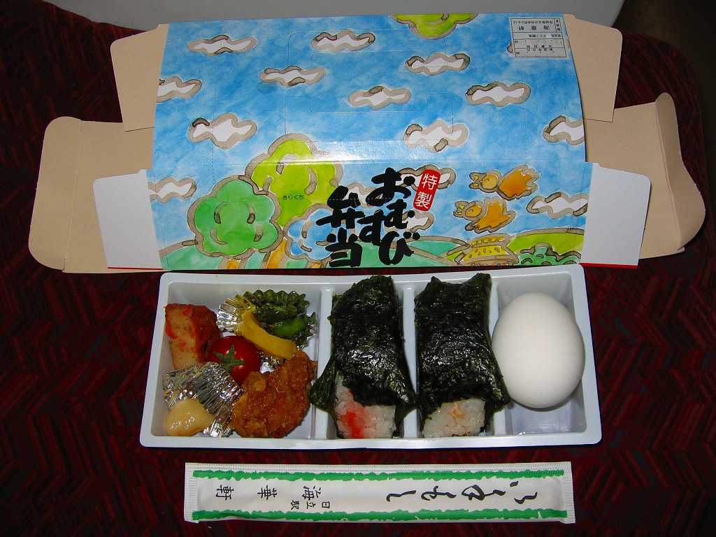 2005(平成17)年の夏までに発売か。伊東の駅弁や横川のバス積込弁とまったく同じ紙箱を使用。中身はツナおむすびとタラコおむすび、ゆで卵1個、鶏唐揚とミニトマトと薩摩揚、煮豆、漬物、タクアン。おにぎりはコンビニで一時期流行した、具を全断面に塗って御飯で挟むサンドイッチ風で、このほうが食べておいしいし、駅弁におそらく類例がなく個性的。少々の割高感はある。2008年に調製元が駅弁から撤退したため、この駅弁も終売となった。