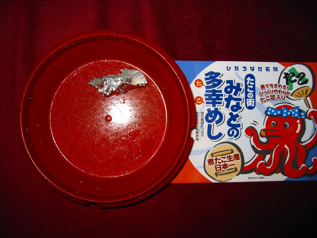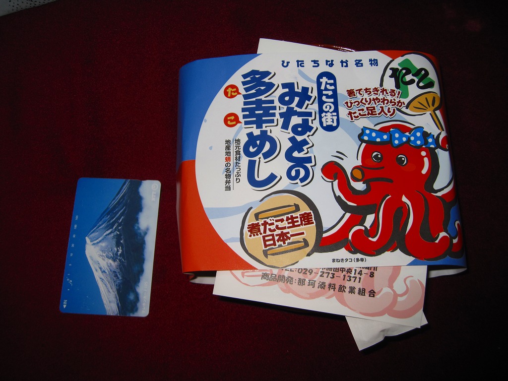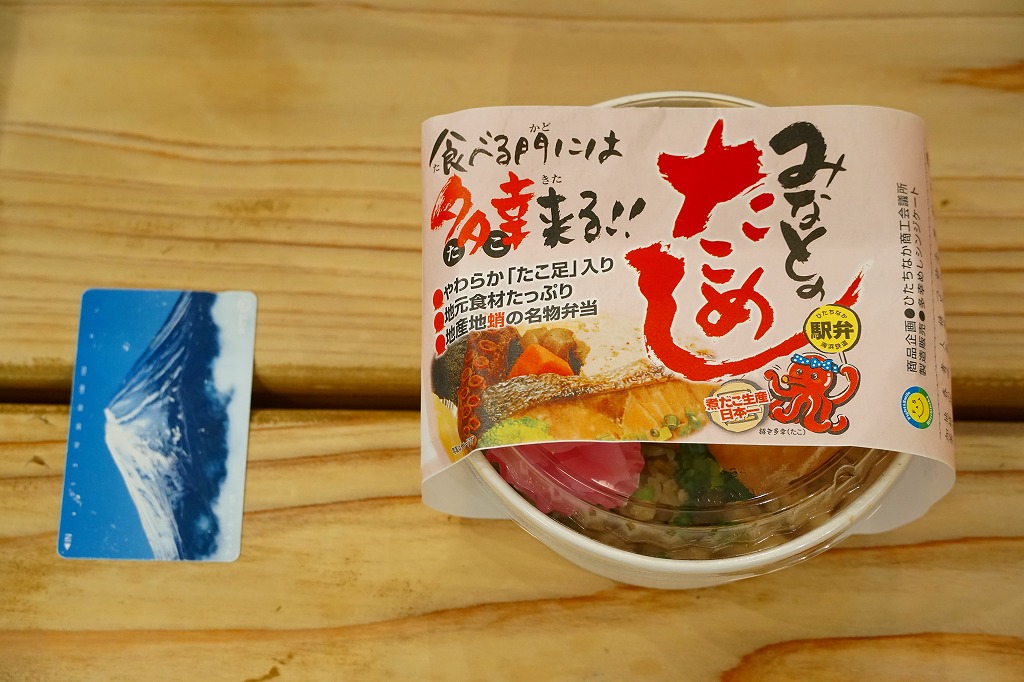 上記の弁当「みなとのたこめし」の、2011(平成23)年時点での姿。名前が「みなとの多幸めし」となっているが、よみがなは変わらない。タコ飯の中身も変わらない。当時はプラ製の釜型容器も各社で共用していた。この時も団体予約購入で、那珂湊駅で停車中の列車に持ってきてもらった。価格は2011年の購入時で800円、2018年時点で880円。