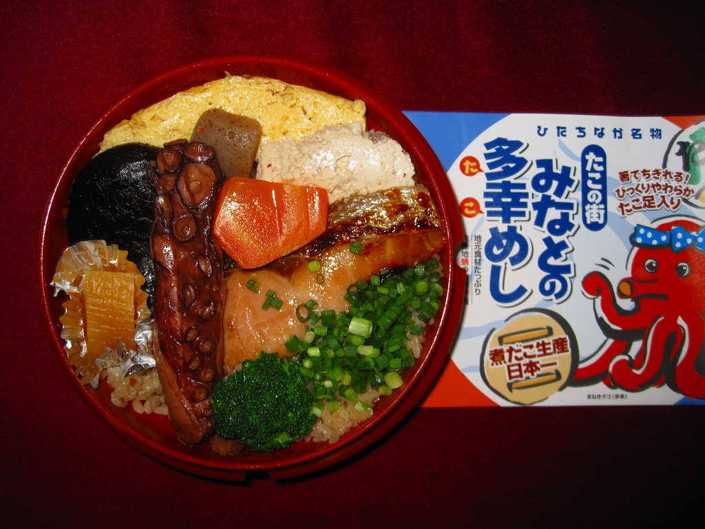昭和30年代から三浜(さんぴん)地区(那珂湊+平磯+磯浜=現在の第三種漁港としての那珂湊の範囲)が日本一の生産地とされる煮ダコが主題。タコ足とその煮汁で炊き込んだ茨城県産米の御飯の上に、マダコあるいは季節によりミズダコの煮物や、地元の鮭、豆腐、野菜などを配置する。醤油も地元産のものを使う。掛紙や容器や、鮭と飯とタコを除く中身は一定していない。