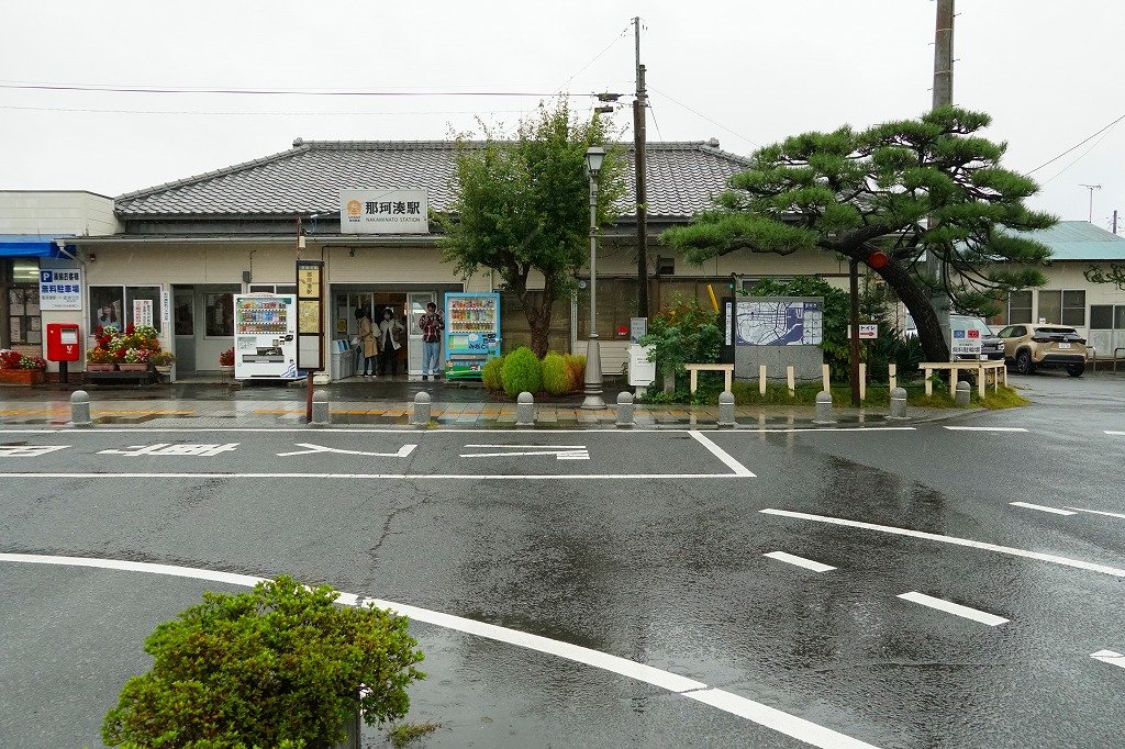 勝田駅から列車で14分。ひたちなか海浜鉄道の本社と車庫がある、中心的な駅。那珂湊は平磯や磯浜(現在の大洗)とともに、江戸時代に漁業や物流の港町として栄え、今も漁港と観光市場が観光客を集める。ひたちなか市の町おこし弁当「みなとの多幸(たこ)めし」が、かつて土曜日に限り駅で売られ、駅弁としても紹介されたことがあった。1913(大正2)年12月25日開業、茨城県ひたちなか市釈迦町。