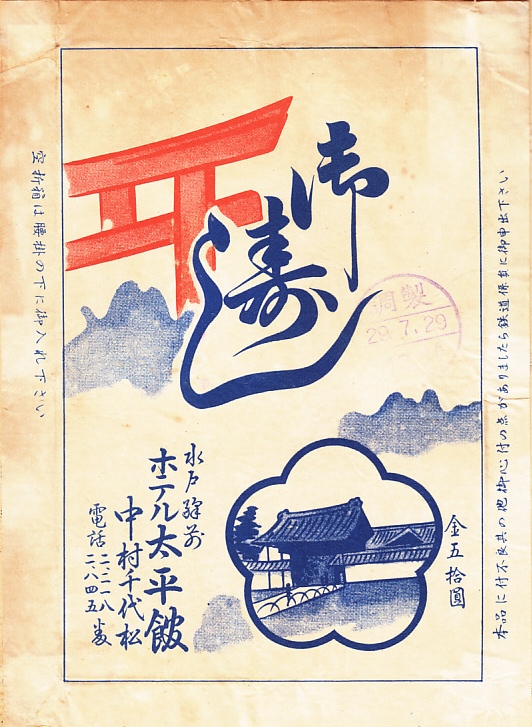 1954(昭和29)年7月29日の調製と思われる、昔の水戸駅弁の掛紙。掛紙に描いたのは、弘道館の正門や正庁と鹿島神社か。江戸時代末期の天保12年(1841)年に水戸藩主の徳川斉昭が水戸城の三の丸に設け、明治5年(1872)年まで存在した藩校。1952(昭和27)年3月に国の特別史跡に、1964(昭和39)年5月に国の重要文化財に指定された。